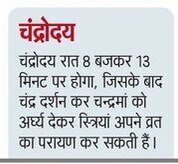 ● संध्याकाल में करवाचौथ पूजन के लिए शाम 4 बजकर 30 मिनट से 6:00 बजे के बीच चर चौघड़िया मुहूर्त रहेगा। इसलिए शाम 4 बजकर 30 मिनट से 6:00 बजे के बीच व्रती स्त्रियां संध्याकाल का करवाचौथ पूजन कर सकती हैं