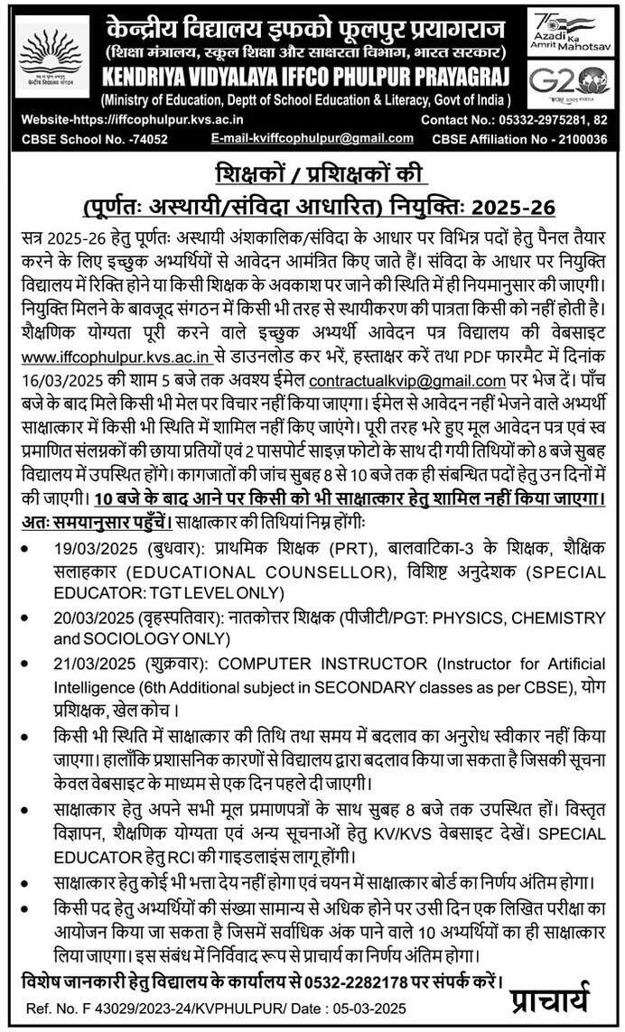 शैक्षिक योग्यता पूरी करने वाले इच्छुक अभ्यर्थी विद्यालय की वेबसाइट www.iffcophulpur.kvs.ac.in से आवेदन पत्र डाउनलोड कर, उसे हस्ताक्षरित कर PDF प्रारूप में दिनांक 16/03/2025 की सायं 5 बजे तक ईमेल contractualkvip@gmail.com पर भेज दें। निर्धारित समय के बाद किसी भी मेल या पत्र को स्वीकार नहीं किया जाएगा।