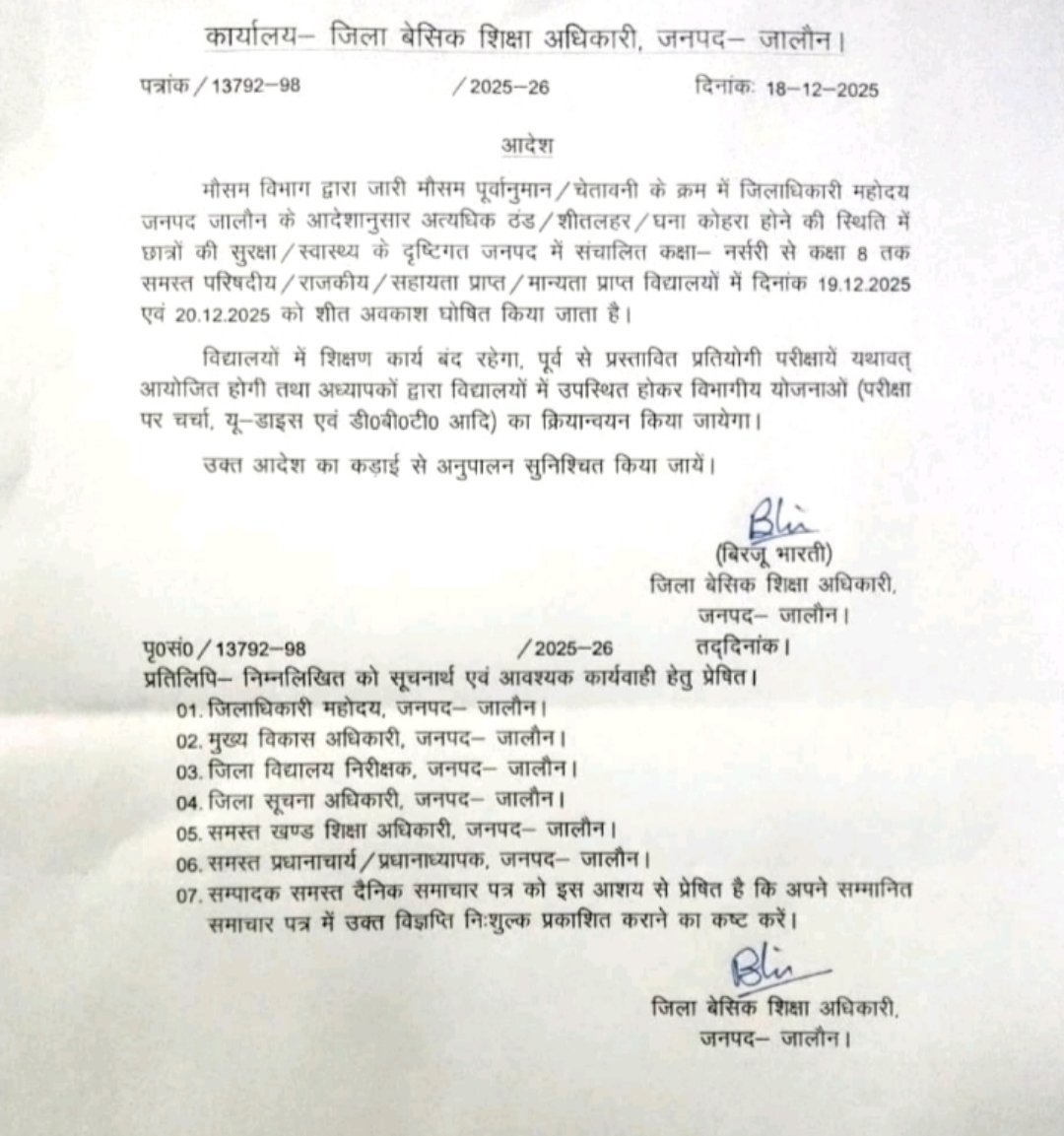 कड़ाके की सर्दी को देखते हुए जिला बेसिक शिक्षा अधिकारी ने नर्सरी से 8 तक के बच्चों की 2 दिन की छुट्टी December 18, 2025 by Ravi Singh कड़ाके की सर्दी को देखते हुए जिला बेसिक शिक्षा अधिकारी ने नर्सरी से 8 तक के बच्चों की 2 दिन की छुट्टी