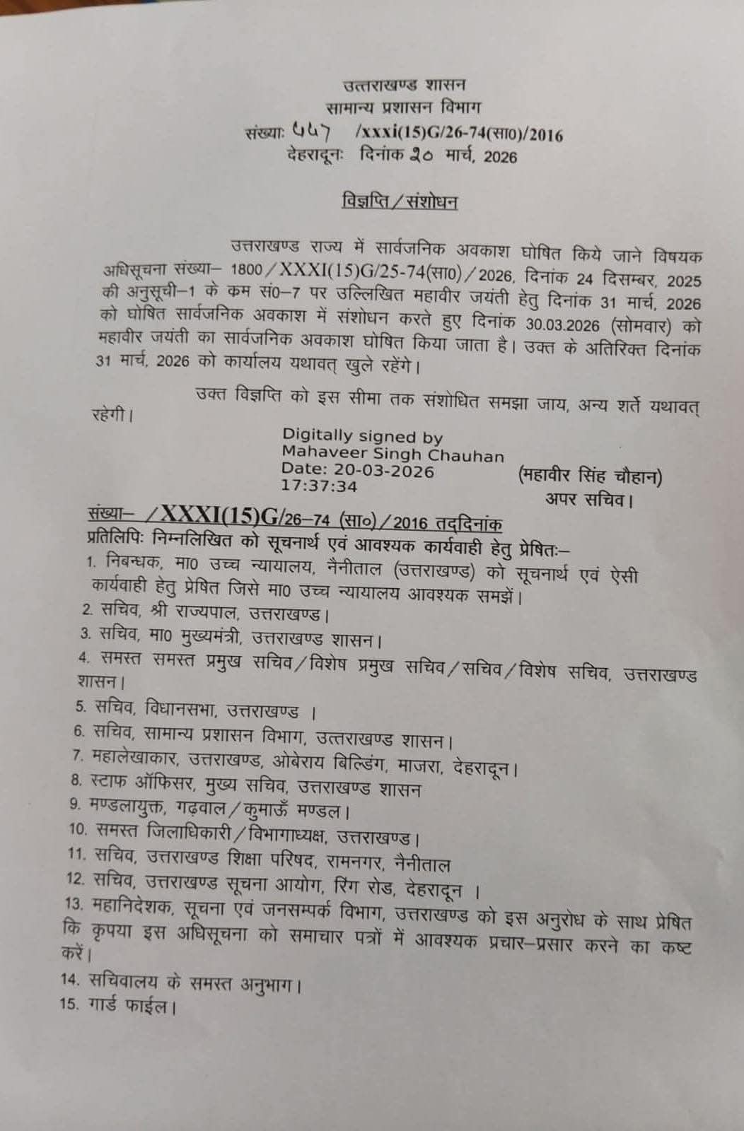 महावीर जयंती हेतु दिनांक 31 मार्च, 2026 को घोषित सार्वजनिक अवकाश में संशोधन करते हुए दिनांक 30.03.2026 (सोमवार) को महावीर जयंती का सार्वजनिक अवकाश घोषित किया गया है।