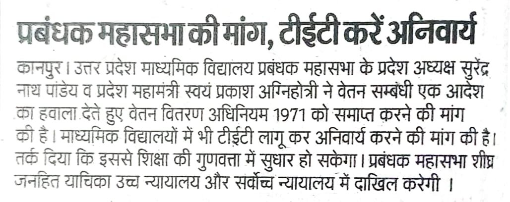 प्रबंधक महासभा की मांग वेतन वितरण अधिनियम 1971 समाप्त किया जाए तथा इंटरमीडिएट विद्यालयों में शिक्षकों के लिये भी TET अनिवार्य किया जाए। इसके लिए प्रबंधक महासभा के लोग उच्च न्यायालय तथा उच्चतम न्यायालय में जनहित याचिका डालने जा रहे हैं।