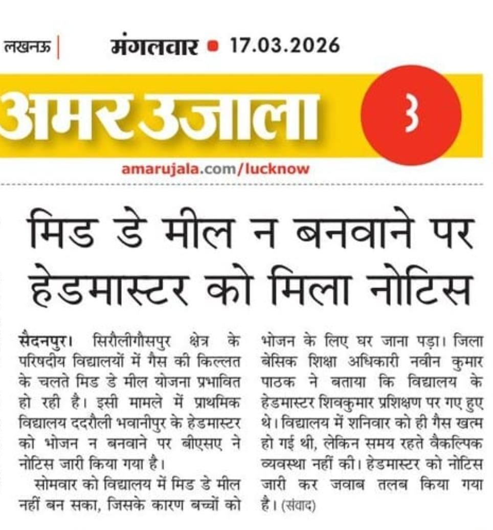 भोजन के लिए घर जाना पड़ा। जिला बेसिक शिक्षा अधिकारी नवीन कुमार पाठक ने बताया कि विद्यालय के हेडमास्टर शिवकुमार प्रशिक्षण पर गए हुए थे। विद्यालय में शनिवार को ही गैस खत्म हो गई थी, लेकिन समय रहते वैकल्पिक व्यवस्था नहीं की। हेडमास्टर को नोटिस जारी कर जवाब तलब किया गया है।