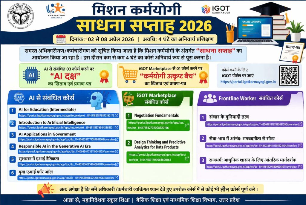 मिशन कर्मयोगी साधना सप्ताह 2026: AI कोर्स करें और पाएं “AI दक्ष” प्रमाण-पत्र, लिंक सहित पूरी जानकारी महत्वपूर्ण सूचना: सभी अधिकारी/कर्मचारियों को 4 घंटे का प्रशिक्षण कोर्स पूरा करना अनिवार्य है। 🎯 विशेष उपलब्धि: ✅ 3 AI कोर्स = AI दक्ष प्रमाण-पत्र ✅ 1 iGOT कोर्स = कर्मयोगी उत्कृष्ट बैच 🤖 AI से संबंधित कोर्स AI for Education (Intermediate)Introduction … Continue reading मिशन कर्मयोगी साधना सप्ताह 2026: AI कोर्स करें और पाएं “AI दक्ष” प्रमाण-पत्र, लिंक सहित पूरी जानकारी