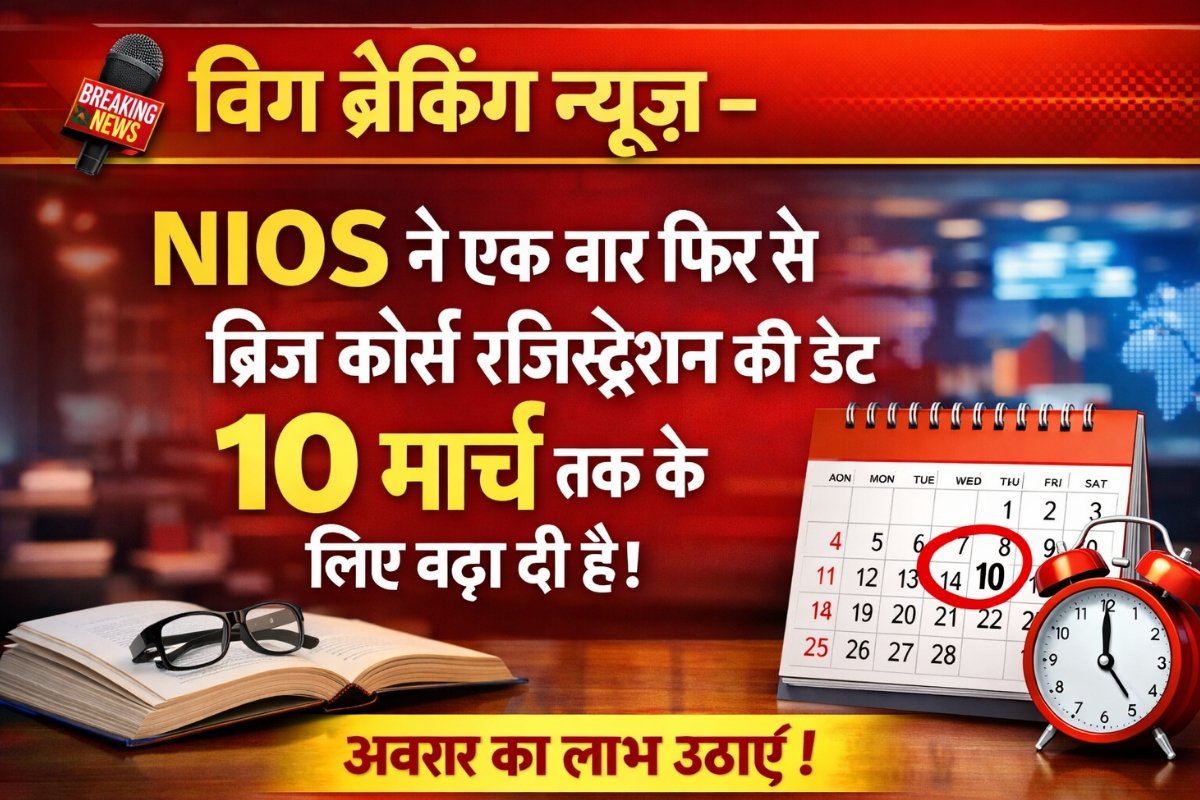 बिग ब्रेकिंग न्यूज़: NIOS ने एक बार फिर से ब्रिज कोर्स रजिस्ट्रेशन की डेट 10 मार्च तक के लिए बढ़ा दी है। February 19, 2026 by Ravi Singh बिग ब्रेकिंग न्यूज़: NIOS ने एक बार फिर से ब्रिज कोर्स रजिस्ट्रेशन की डेट 10 मार्च तक के लिए बढ़ा दी है।