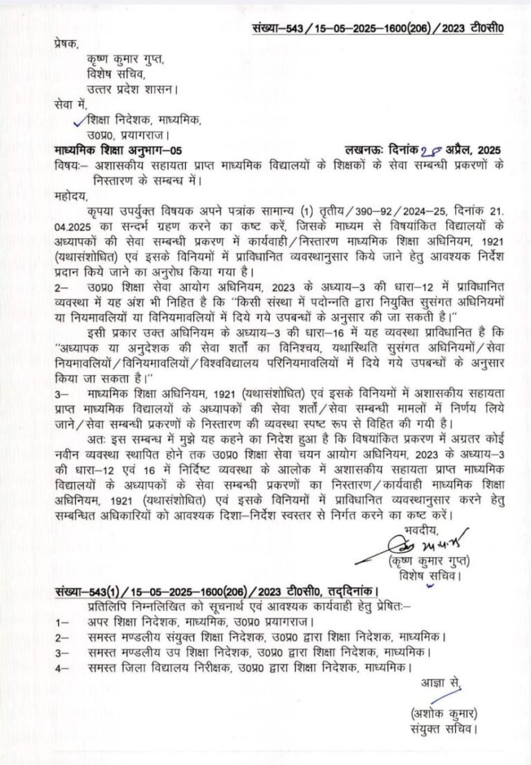 अशासकीय सहायता प्राप्त माध्यमिक विद्यालयों के शिक्षकों के सेवा सम्बन्धी प्रकरणों के निस्तारण के सम्बन्ध में।