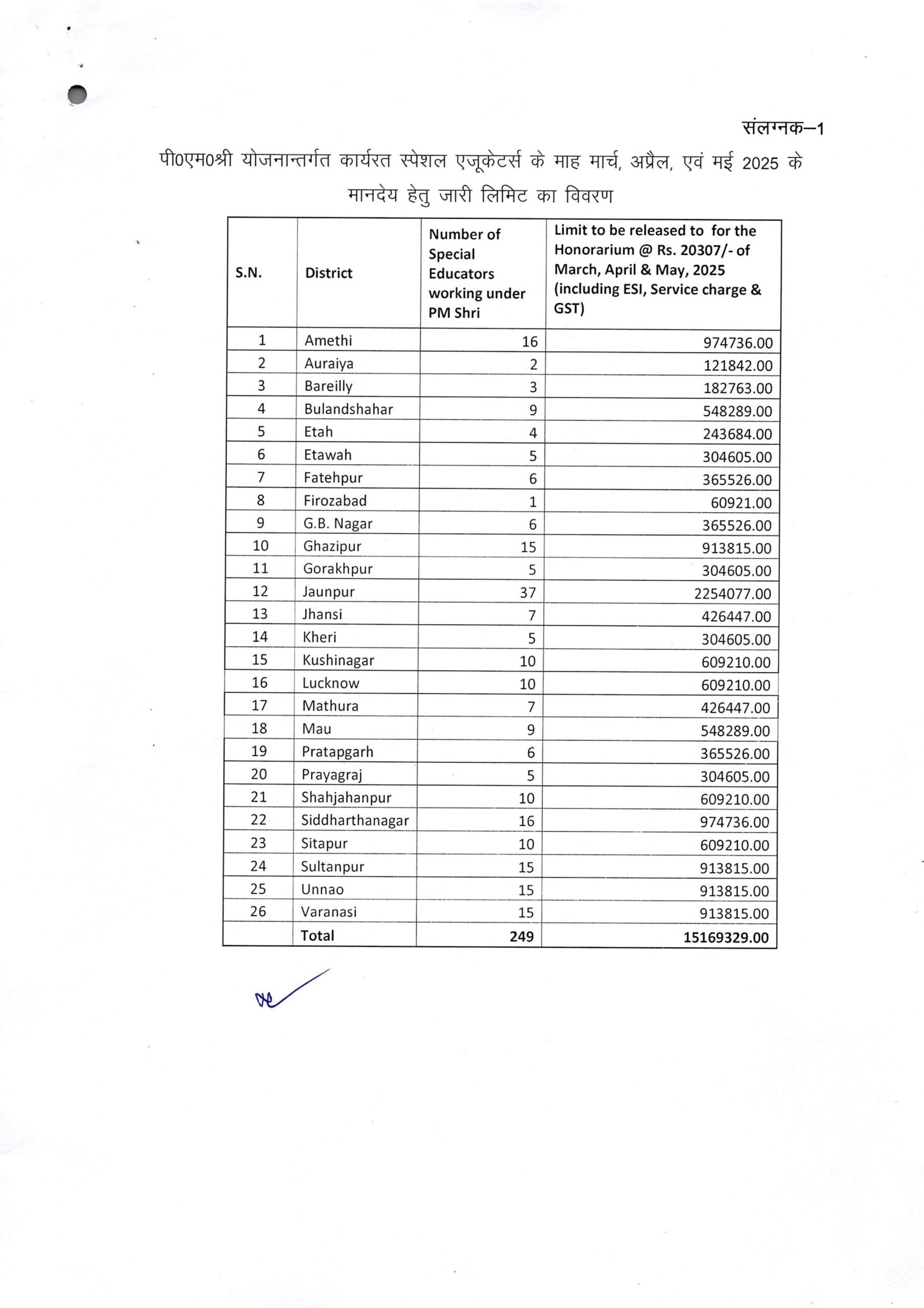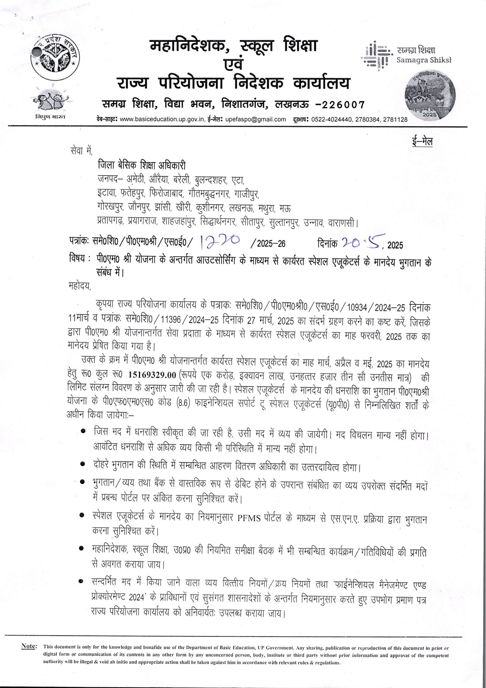 पी0एम0 श्री योजना के अन्तर्गत आउटसोर्सिग के माध्यम से कार्यरत स्पेशल एजूकेटर्स के मानदेय भुगतान के संबंध में। May 21, 2025 by Jaswant Singh पी0एम0 श्री योजना के अन्तर्गत आउटसोर्सिग के माध्यम से कार्यरत स्पेशल एजूकेटर्स के मानदेय भुगतान के संबंध में।