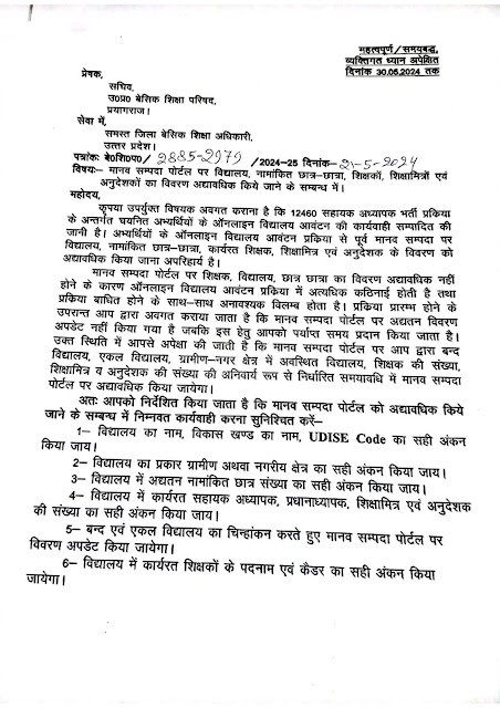 मानव सम्पदा पोर्टल पर विद्यालय, नामांकित छात्र-छात्रा, शिक्षकों, शिक्षामित्रों एवं अनुदेशकों का विवरण अद्यावधिक किये जाने के सम्बन्ध में