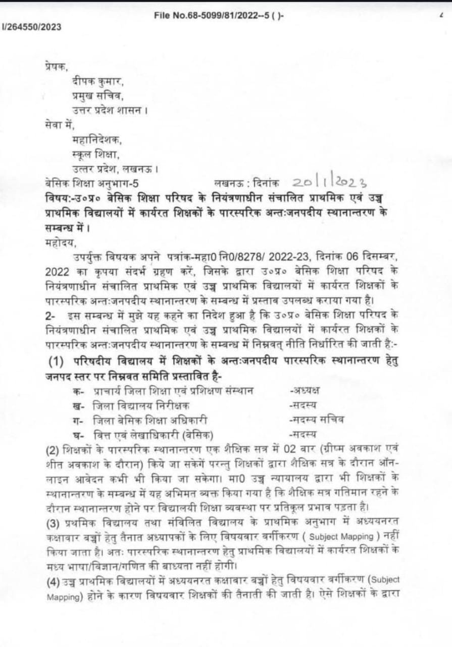 प्रमुख सचिव उत्तर प्रदेश शासन के दिनांक 20 जनवरी 2023 के शासनादेश के अनुसार-शिक्षकों के पारस्परिक स्थानान्तरण कब कब संभव