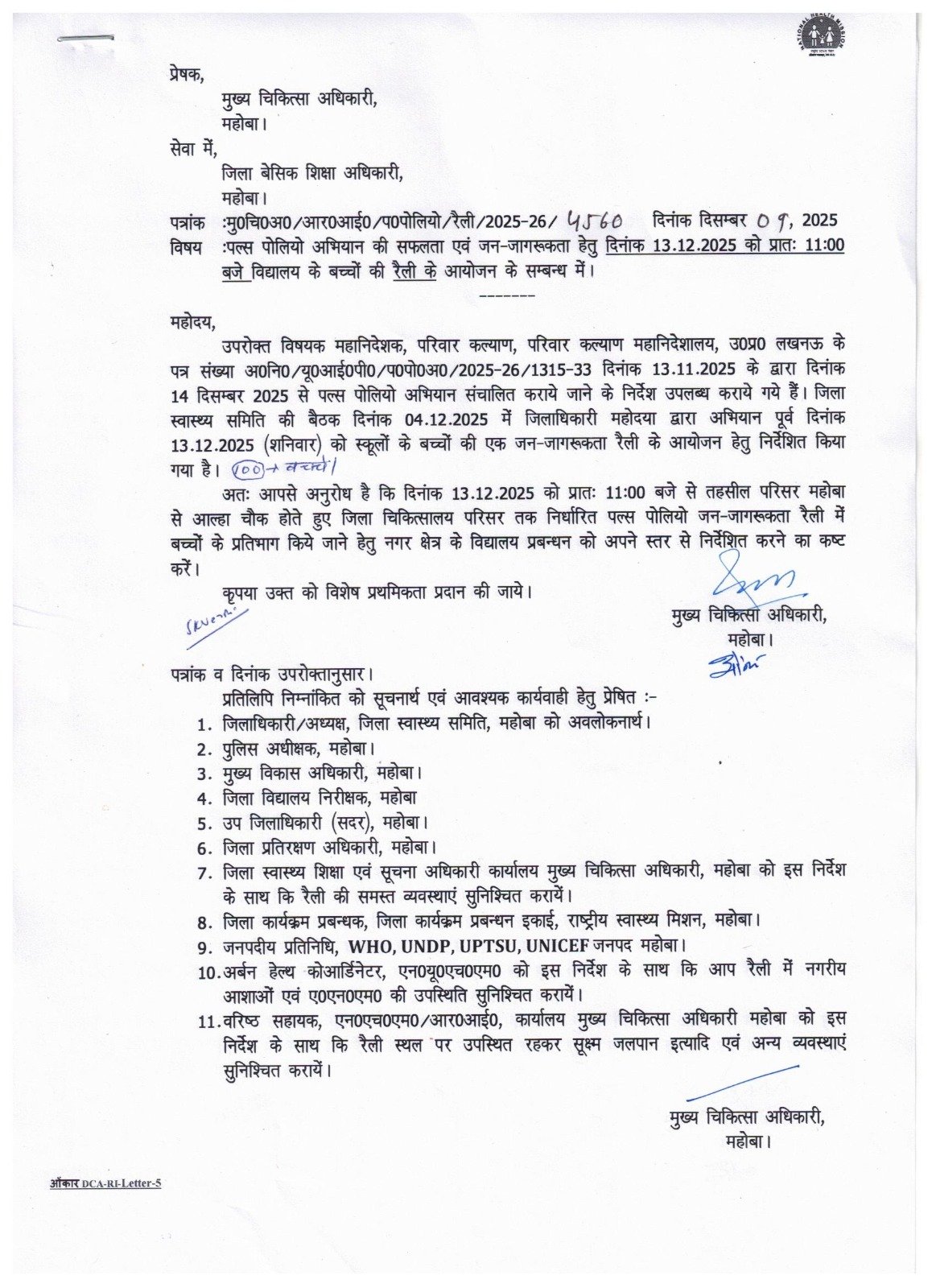 पल्स पोलियो अभियान की सफलता एवं जन-जागरूकता हेतु दिनांक 13.12.2025 को प्रातः 11:00 बजे विद्यालय के बच्चों की रैली के आयोजन के सम्बन्ध में।