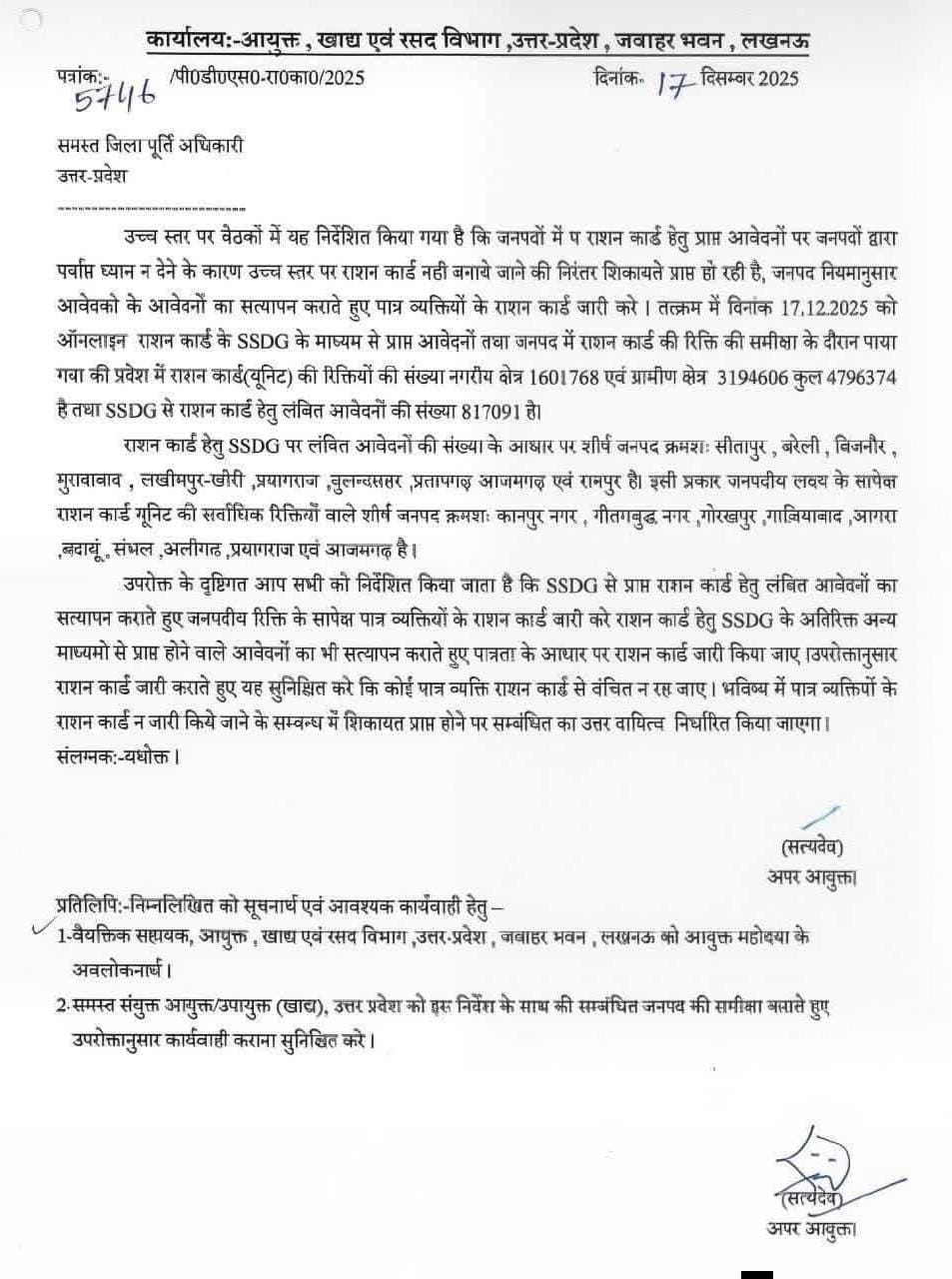 उच्च स्तर पर बैठकों में यह निर्देशित किया गया है कि जनपदों में प राशन कार्ड हेतु प्राप्त आवेदनों पर जनपदों द्वारा पर्याप्त ध्यान न देने के कारण उच्च स्तर पर राशन कार्ड नही बनाये जाने की निरंतर शिकायते प्राप्त हो रही है, जनपद नियमानुसार आवेवको के आवेदनों का सत्यापन कराते हुए पात्र व्यक्तियों के राशन कार्ड जारी करे। तत्क्रम में विनांक 17.12.2025 को ऑनलाइन राशन कार्ड के SSDG के माध्यम से प्राप्त आवेदनों तथा जनपद में राशन कार्ड की रिक्ति की समीक्षा के दौरान पाया गवा की प्रवेश में राशन कार्ड (यूनिट) की रिक्तियों की संख्या नगरीय क्षेत्र 1601768 एवं ग्रामीण क्षेत्र 3194606 कुल 4796374 है तथा SSDG से राशन कार्ड हेतु लंबित आवेदनों की संख्या 817091 है।