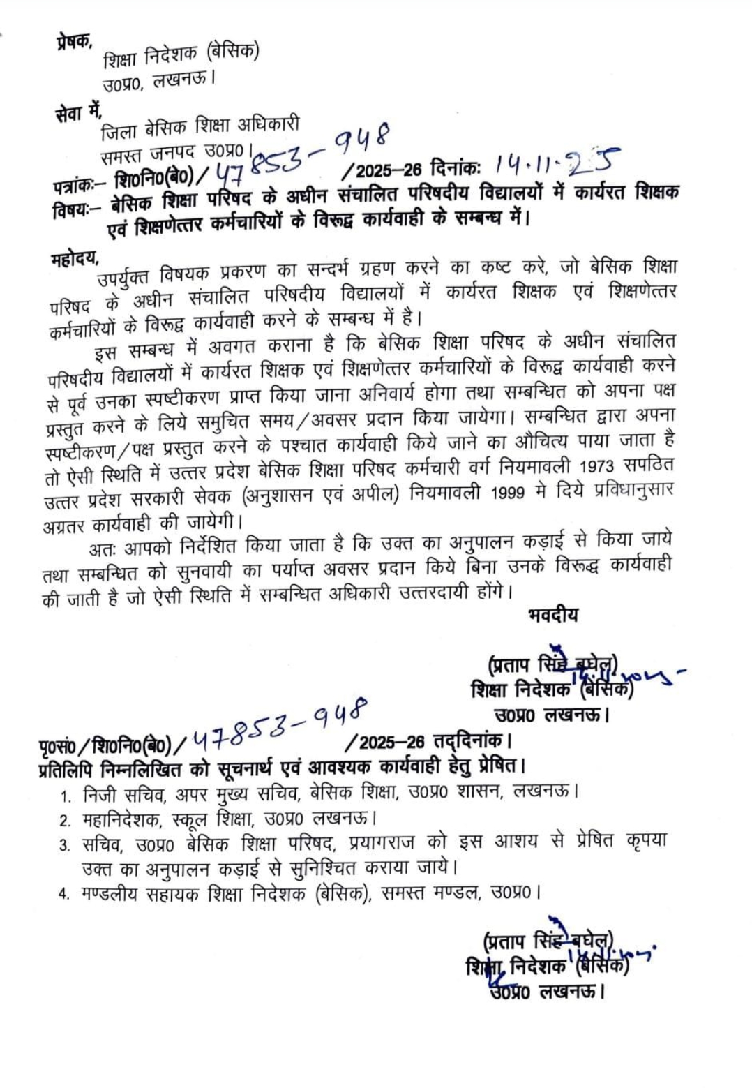 बेसिक शिक्षा परिषद के अधीन संचालित परिषदीय विद्यालयों में कार्यरत शिक्षक एवं शिक्षणेत्तर कर्मचारियों के विरूद्ध कार्यवाही के सम्बन्ध में।