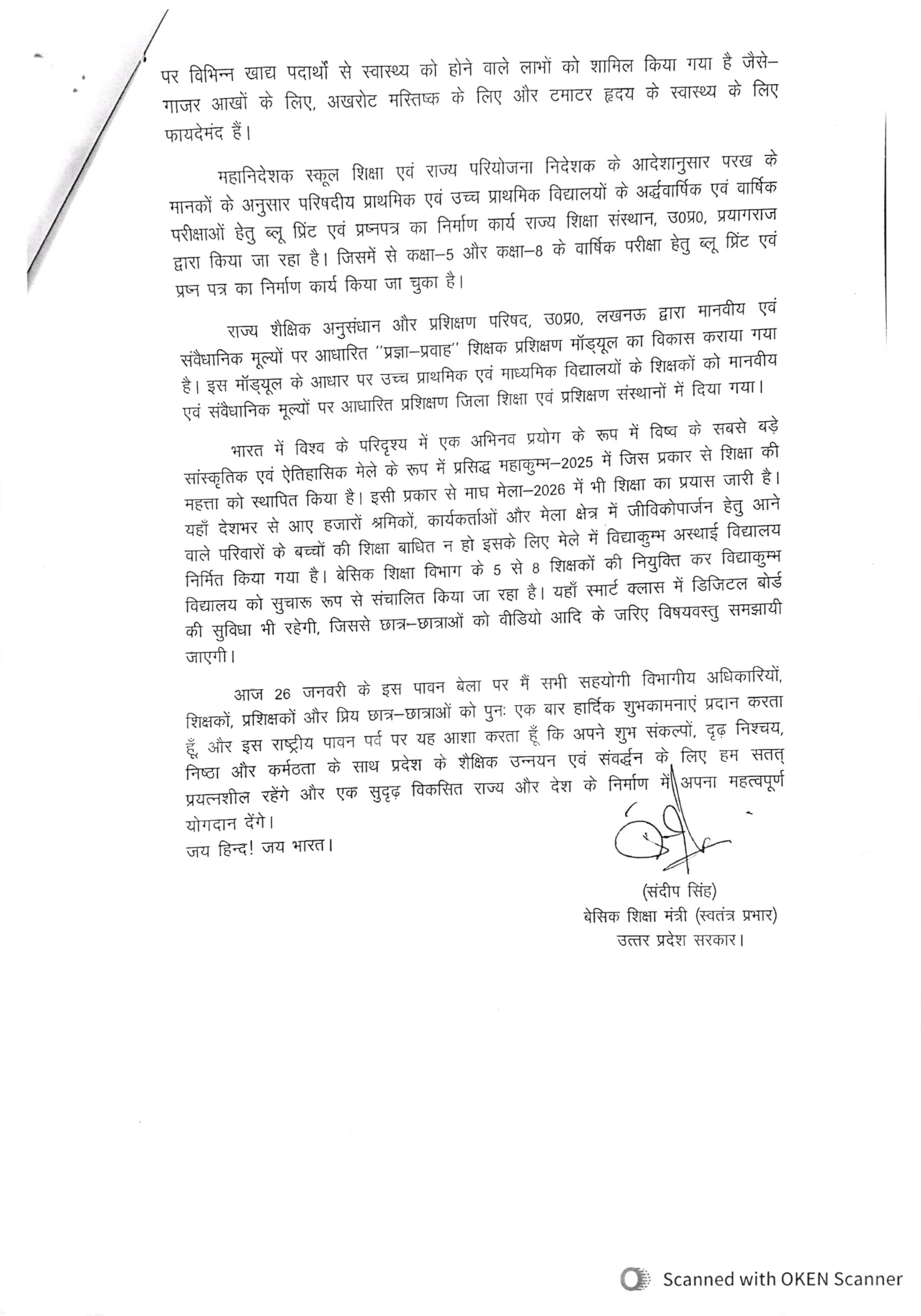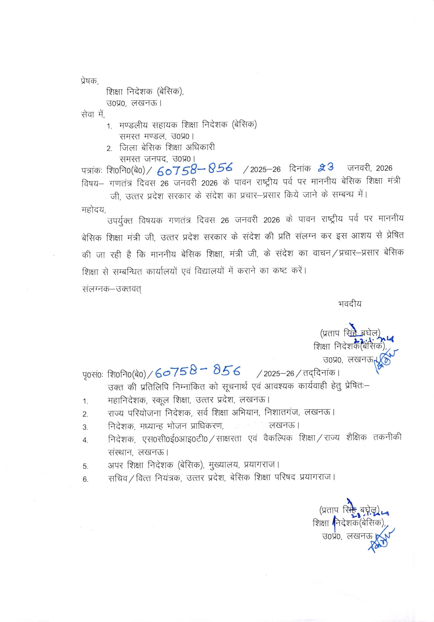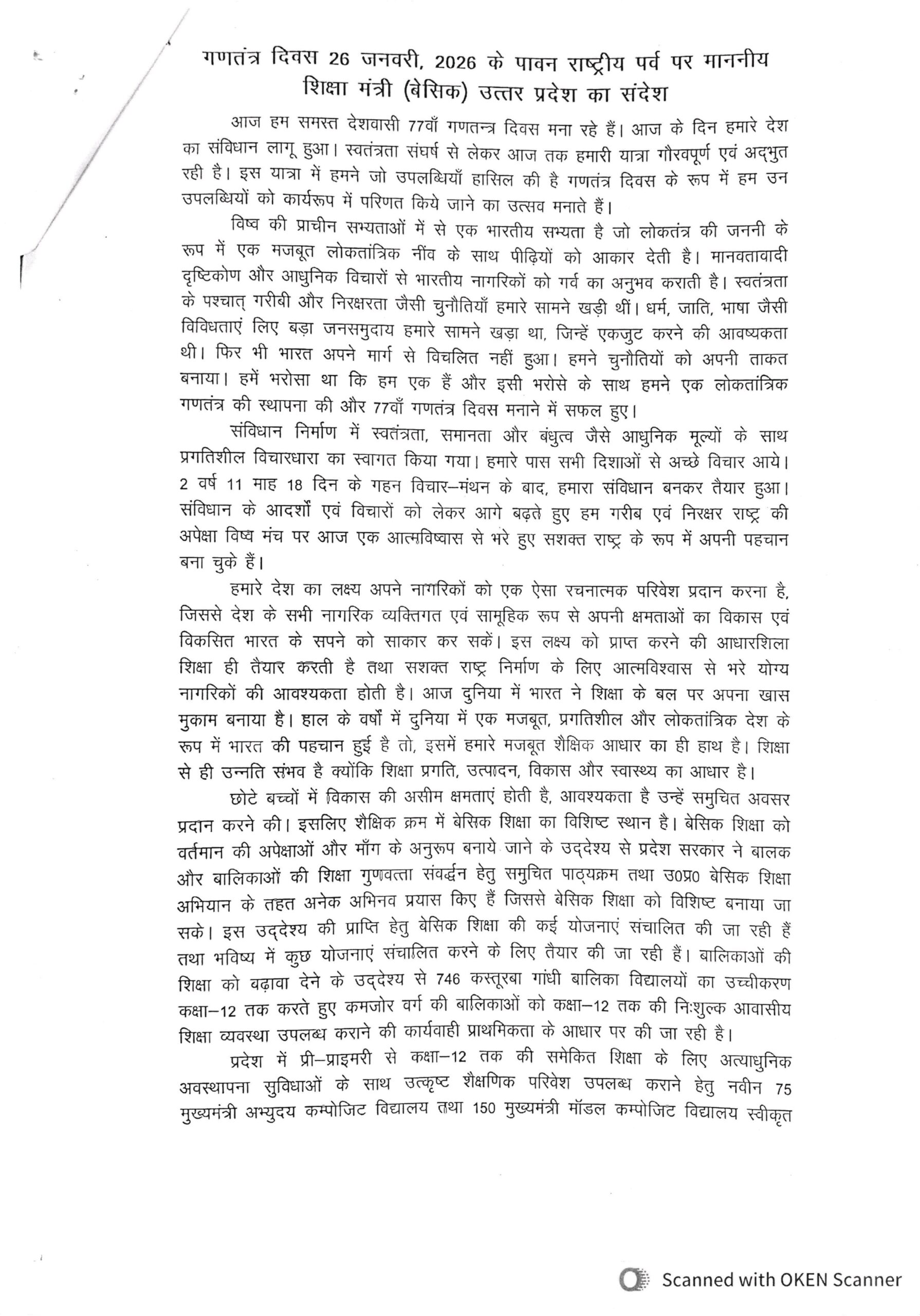 गणतंत्र दिवस 26 जनवरी 2026 के पावन राष्ट्रीय पर्व पर माननीय बेसिक शिक्षा मंत्री जी, उत्तर प्रदेश सरकार के संदेश का प्रचार-प्रसार किये जाने के सम्बन्ध में।