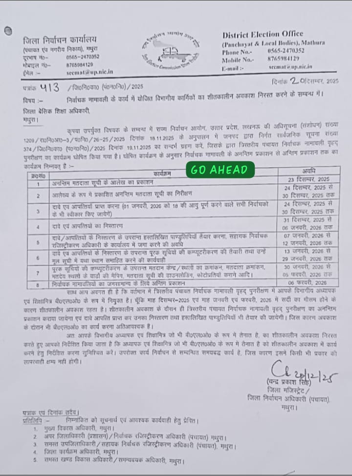 साथ आप अवगत ही है कि वर्तमान में त्रिस्तरीय पंचायत निर्वाचक नामावली पृहद् पुनरीक्षण में आपसे विभागीय अध्यापक एवं शिक्षामित्र वी०एल०ओ० के रूप में नियुक्त है। चूंकि माह दिसम्बर-2025 एवं माह जनवरी एवं फरवरी, 2026 में सदी का मौसम होने के कारण शीतकालीन अवकाश रहता है। शीतकालीन अवकाश के दौरान ही त्रिस्तरीय पंचायत निर्वाचक नामावली वृहद् पुनरीक्षण का अनन्तिम प्रकाशन कराया जायेगा एवं दावे आपत्ति प्राप्त कर उनका निस्तारण तथा हस्तलिखित पाण्डुलिपियों भी तैयार की जायेगी। जिस कारण अवकाश के दोरान भी बी०एल०ओ० का कार्य करना अतिआवश्यक है।