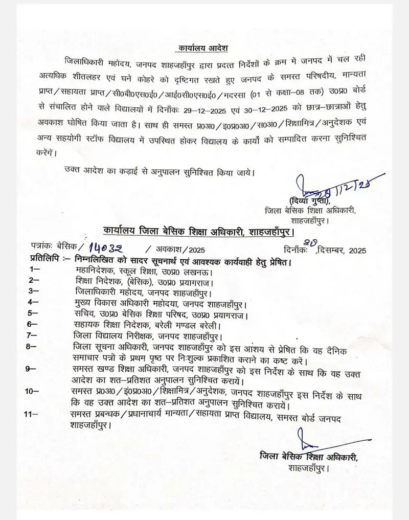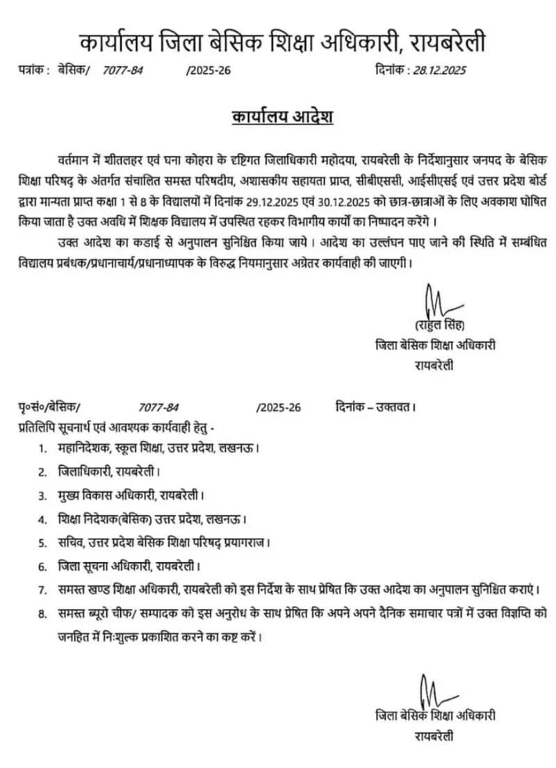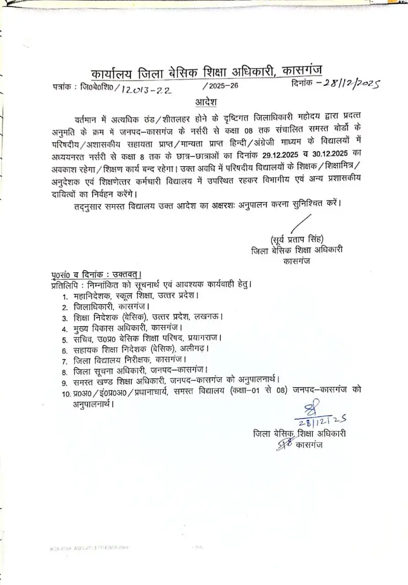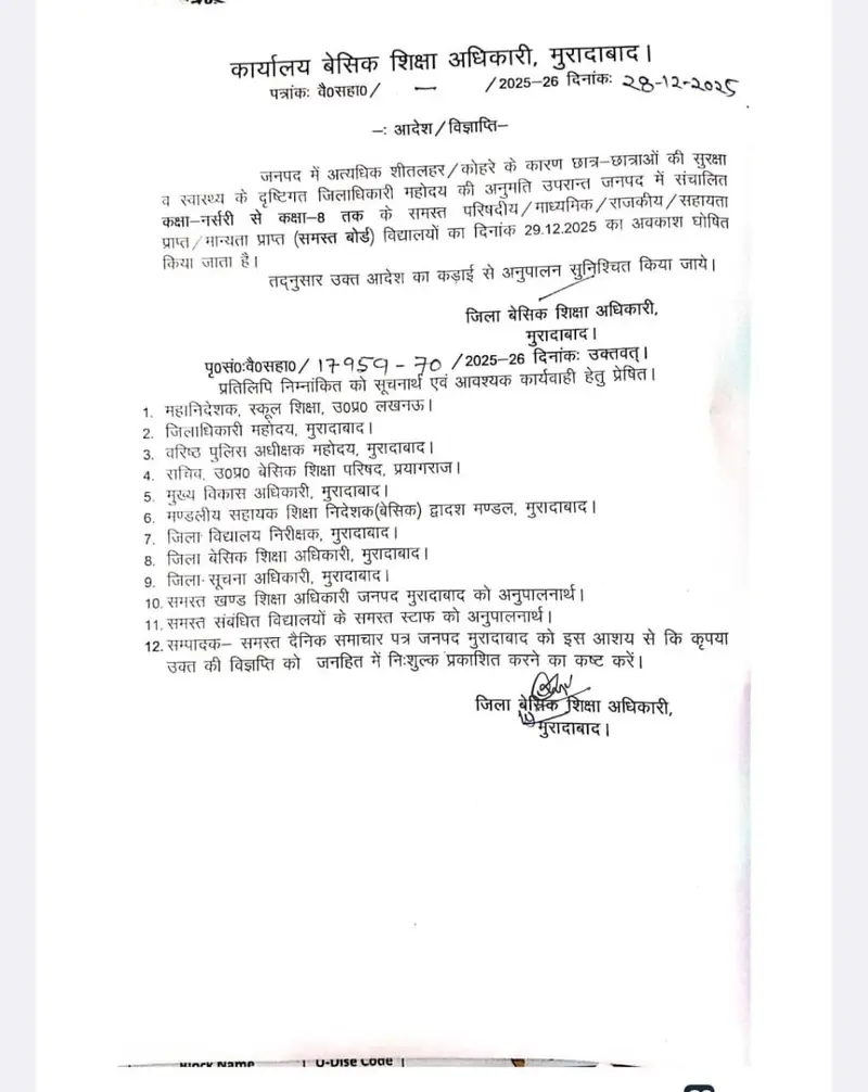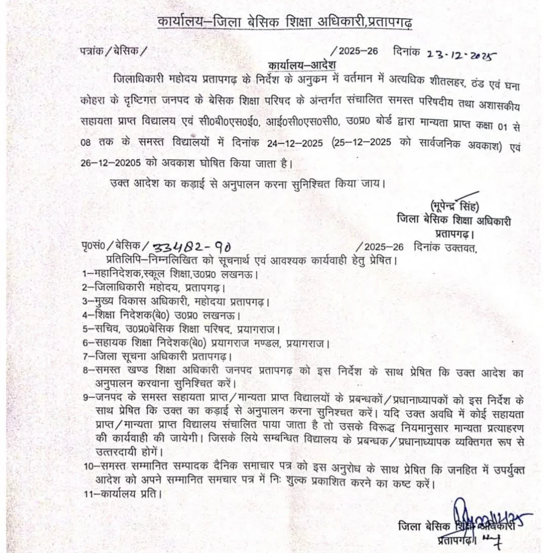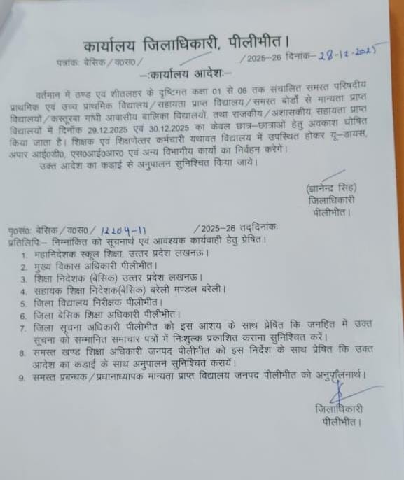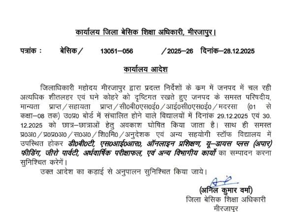अत्यधिक ठंढ और शीतलहर के दृष्टिगत जिलाधिकारी महोदय की अनुमति के क्रम में दिनांक 29 दिसम्बर एवँ 30 दिसम्बर 2025 को कक्षा 1 से 8 तक सभी परिषदीय विद्यालय ,मान्यता प्राप्त ,सहायता प्राप्त, सीबीएसई / आईसीएसई /उ0प्र0 बोर्ड के विद्यालय केवल बच्चों हेतु बंद रहेंगे !