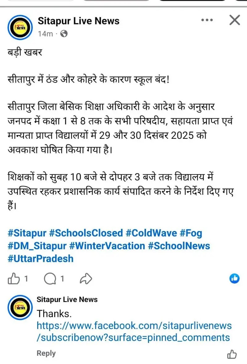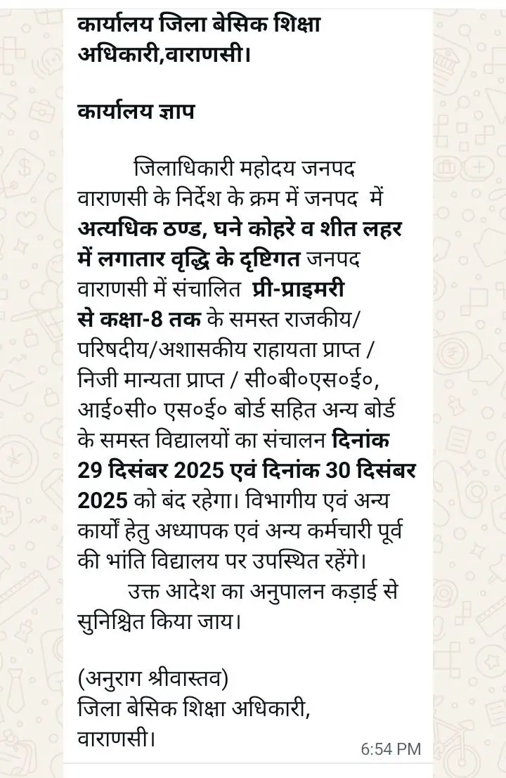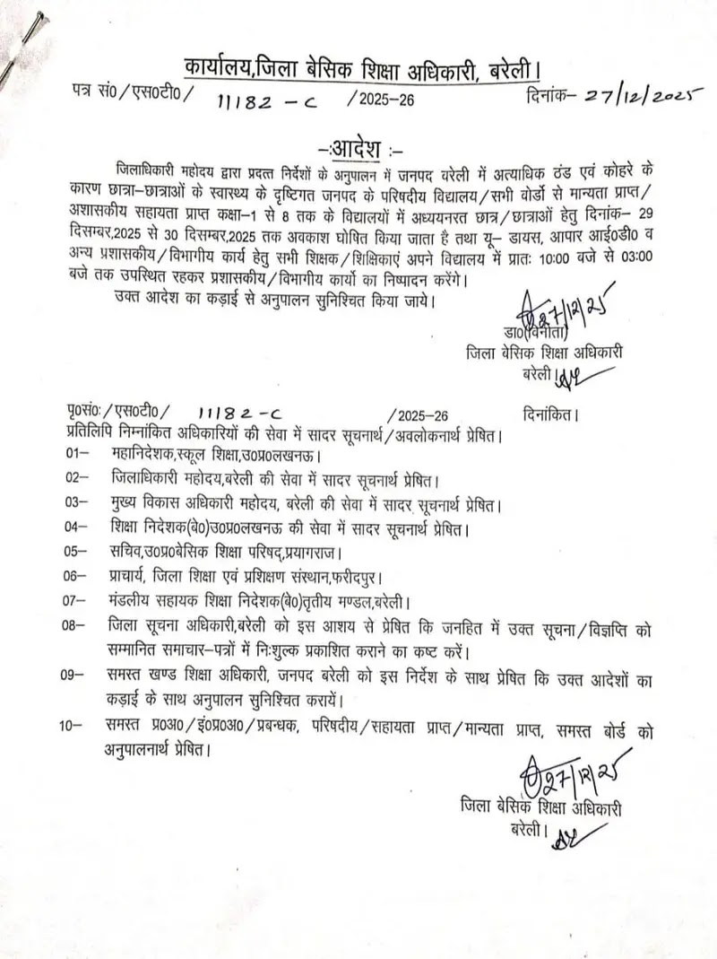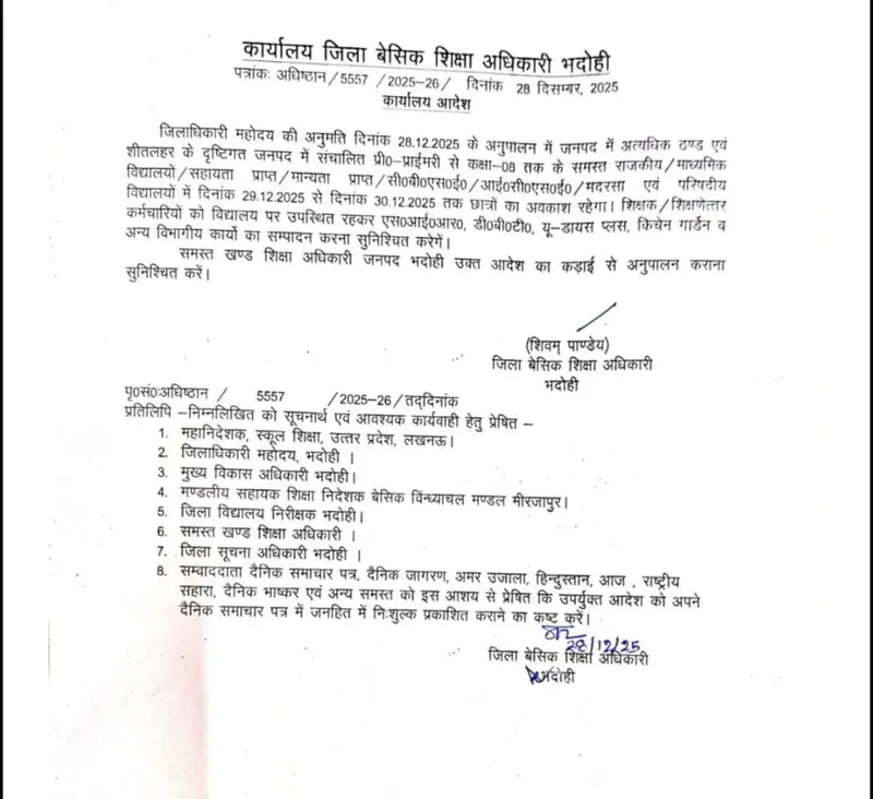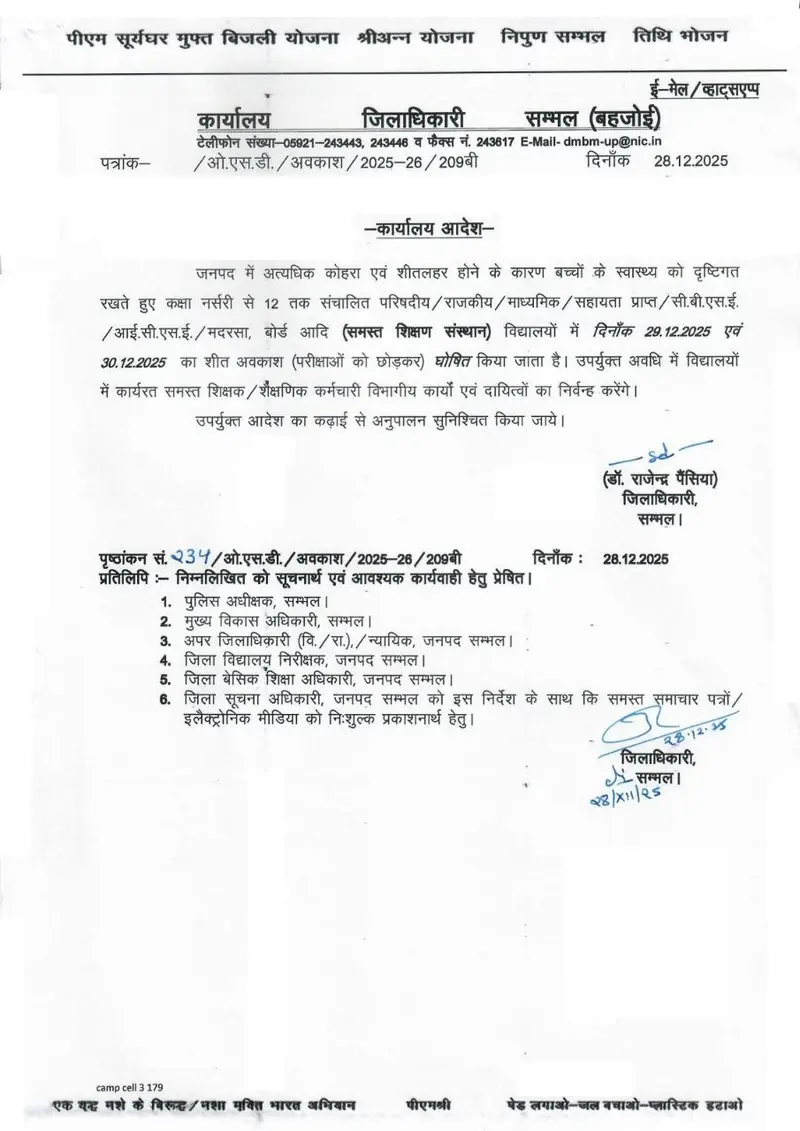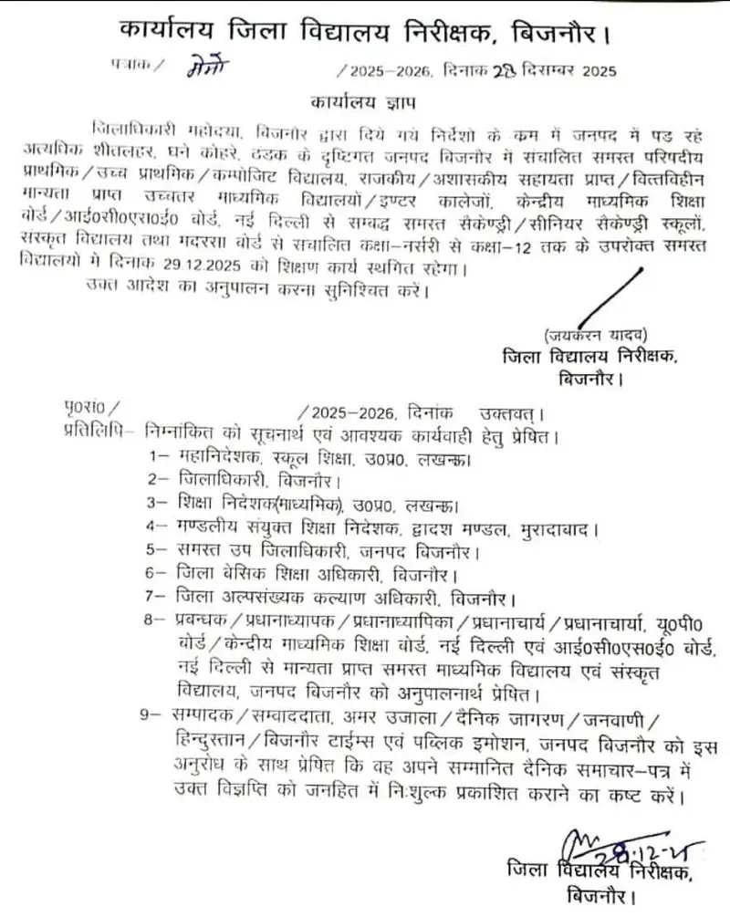 अत्यधिक ठंढ और शीतलहर के दृष्टिगत जिलाधिकारी महोदय की अनुमति के क्रम में दिनांक 29 दिसम्बर एवँ 30 दिसम्बर 2025 को कक्षा 1 से 8 तक सभी परिषदीय विद्यालय ,मान्यता प्राप्त ,सहायता प्राप्त, सीबीएसई / आईसीएसई /उ0प्र0 बोर्ड के विद्यालय केवल बच्चों हेतु बंद रहेंगे !