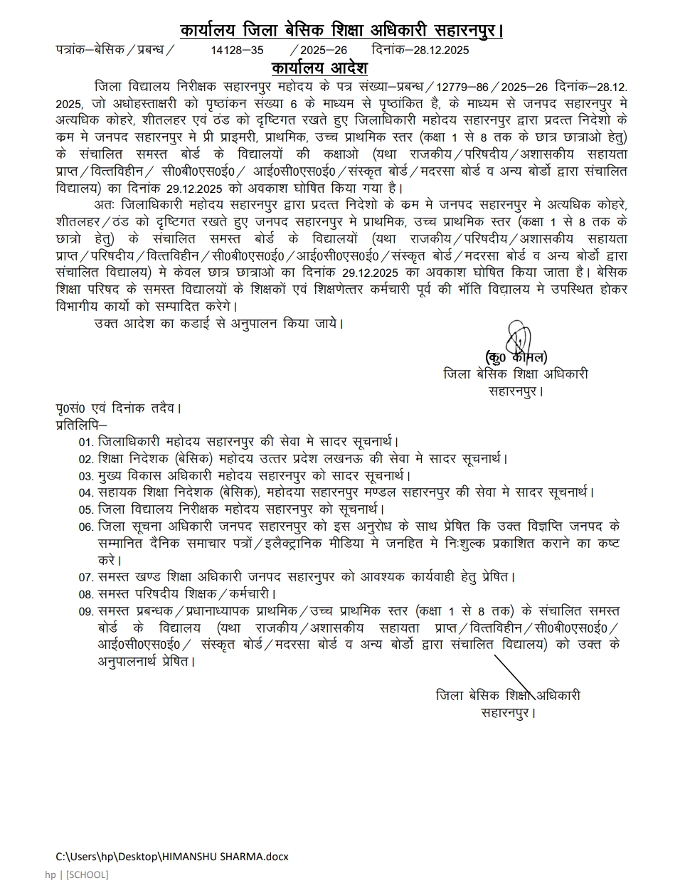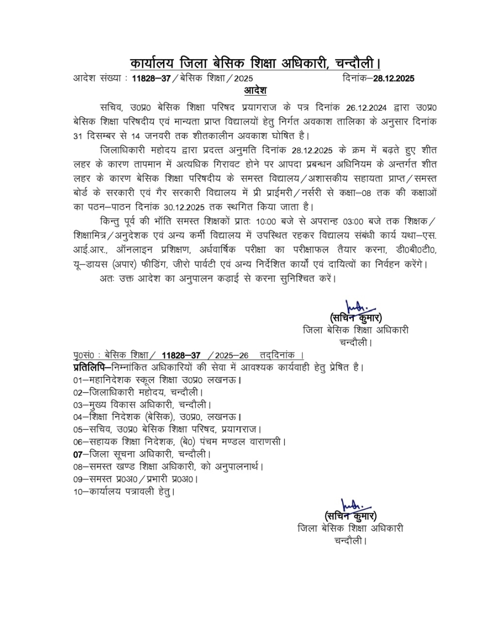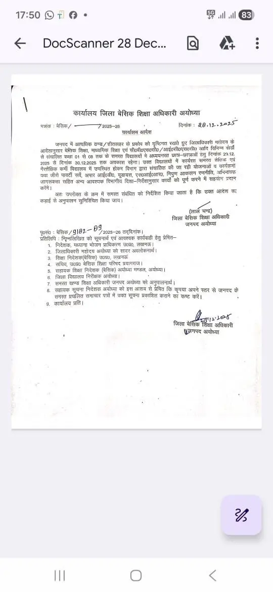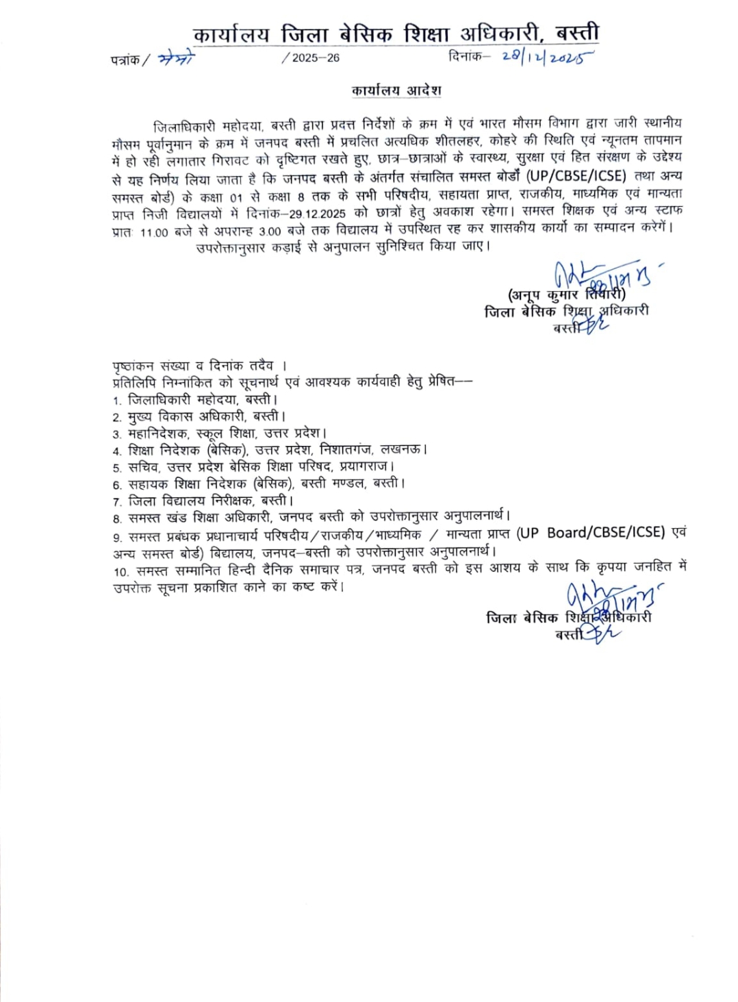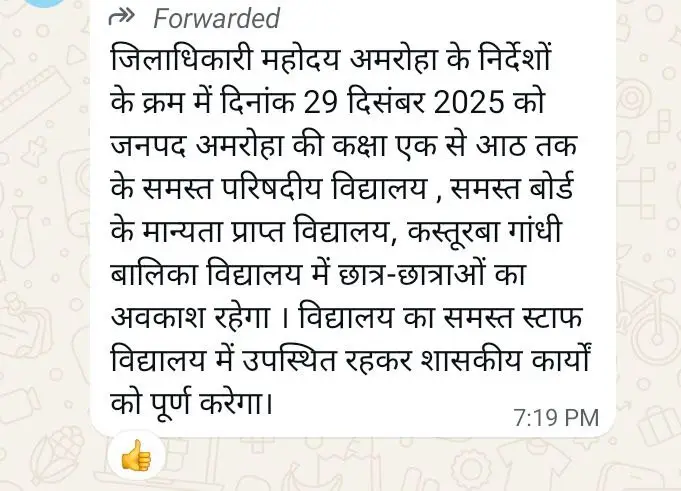 अत्यधिक ठंढ और शीतलहर के दृष्टिगत जिलाधिकारी महोदय की अनुमति के क्रम में दिनांक 29 दिसम्बर एवँ 30 दिसम्बर 2025 को कक्षा 1 से 8 तक सभी परिषदीय विद्यालय ,मान्यता प्राप्त ,सहायता प्राप्त, सीबीएसई / आईसीएसई /उ0प्र0 बोर्ड के विद्यालय केवल बच्चों हेतु बंद रहेंगे !
