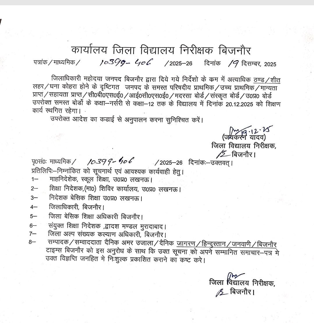 जिलाधिकारी महोदया जनपद बिजनौर द्वारा दिये गये निर्देशो के कम में अत्याधिक ठण्ड/शीत लहर/घना कोहरा होने के दृष्टिगत जनपद के समस्त परिषदीय प्राथमिक/उच्च प्राथमिक/ मान्यता प्राप्त/सहायता प्राप्त/सी०बी०एस०ई०/ आई०सी०एस०ई०/ मदरसा बोर्ड / संस्कृत बोर्ड /उ०प्र० बोर्ड उपरोक्त समस्त बोर्डो के कक्षा नर्सरी से कक्षा 12 तक के विद्यालय में दिनांक 20.12.2025 को शिक्षण कार्य स्थगित रहेगा।