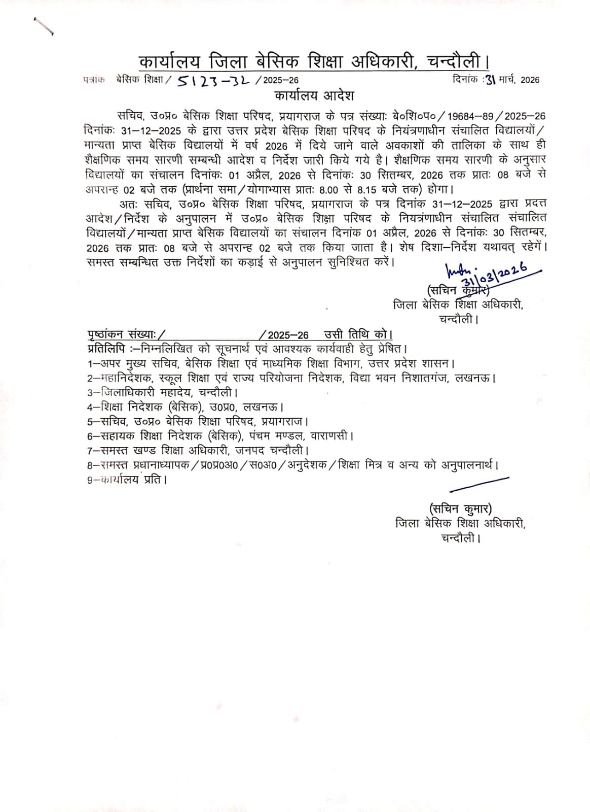 सत्र 2026 हेतु विद्यालय संचालन समय व अवकाश तालिका के अनुपालन संबंधी आदेश (31 मार्च 2026) April 1, 2026 by Ravi Singh सत्र 2026 हेतु विद्यालय संचालन समय व अवकाश तालिका के अनुपालन संबंधी आदेश (31 मार्च 2026)