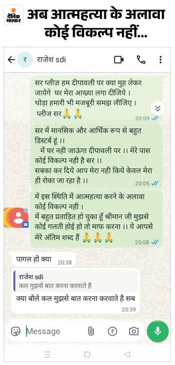 शिक्षक सर, मैं मानसिक और आर्थिक रूप से बहुत डिप्रेशन में हूं। इस स्थिति में मैं दीपावली पर घर नहीं जा पाऊंगा। मेरे पास अब कोई विकल्प नहीं बचा है। सर, सबका कार्य कर दिया गया है, केवल मेरा ही रोका गया है। मुझे लग रहा है कि मुझे जानबूझकर प्रताड़ित किया जा रहा है।