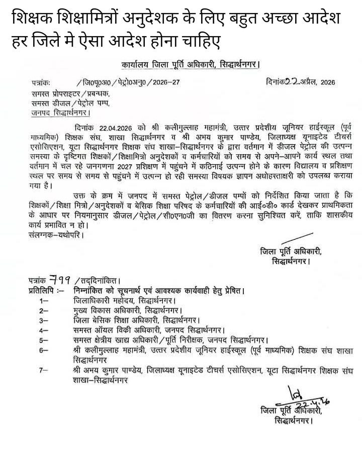 जिला पूर्ति अधिकारी, सिद्धार्थनगर द्वारा शिक्षकों, शिक्षामित्रों एवं अनुदेशकों की सुविधा को ध्यान में रखते हुए एक महत्वपूर्ण आदेश जारी किया गया है। इस आदेश का उद्देश्य विद्यालयों से संबंधित कार्यों के दौरान आने-जाने में ईंधन की समस्या को दूर करना है।