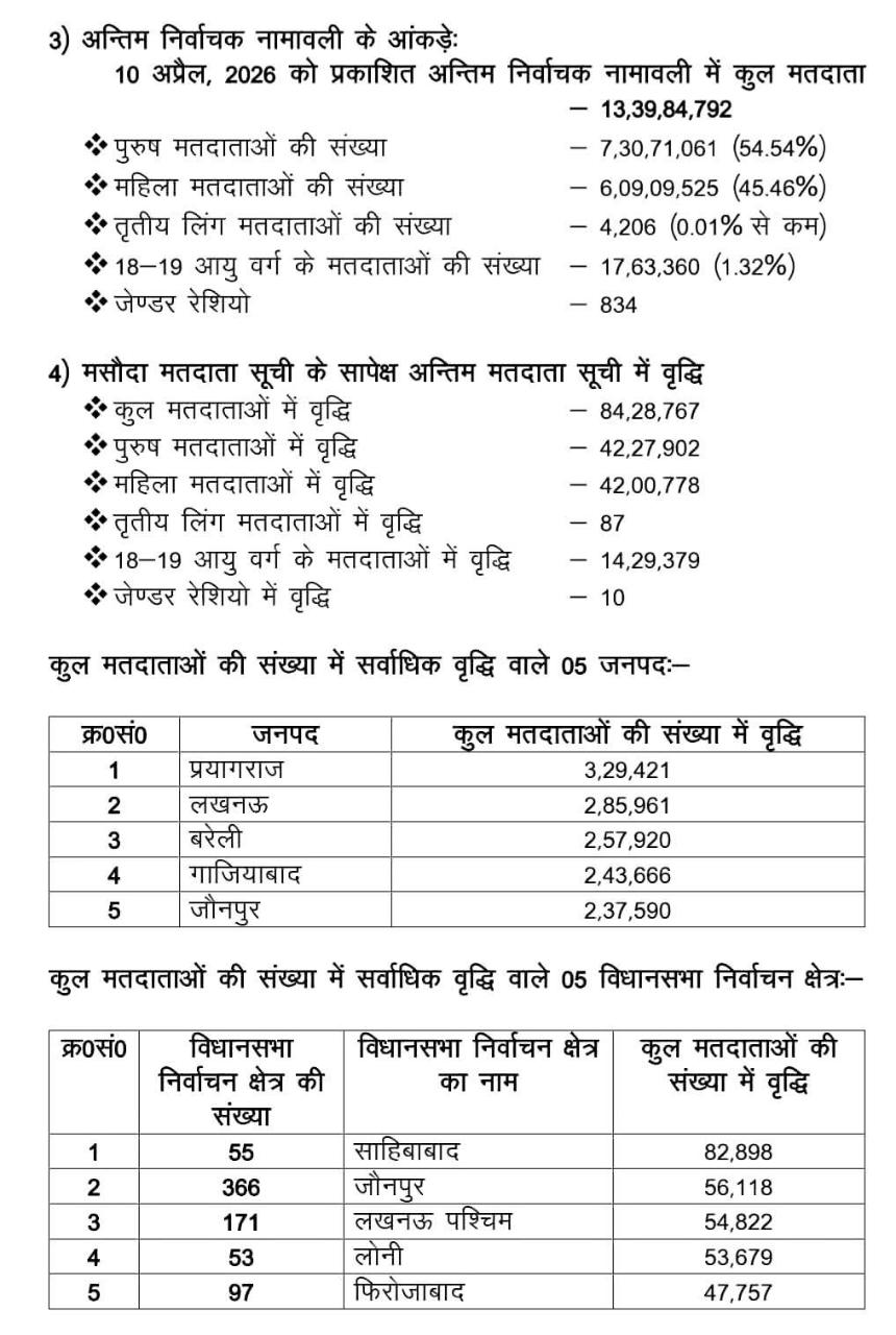 जारी आंकड़ों के अनुसार, प्रदेश में कुल मतदाताओं की संख्या 13 करोड़ 39 लाख 84 हजार 792 पहुंच गई है। इसमें पुरुष मतदाताओं की संख्या 7 करोड़ 30 लाख 71 हजार 61 है, जो कुल का 54.54% है। वहीं महिला मतदाताओं की संख्या 6 करोड़ 9 लाख 9 हजार 525 दर्ज की गई है, जो कुल का 45.46% हिस्सा है।