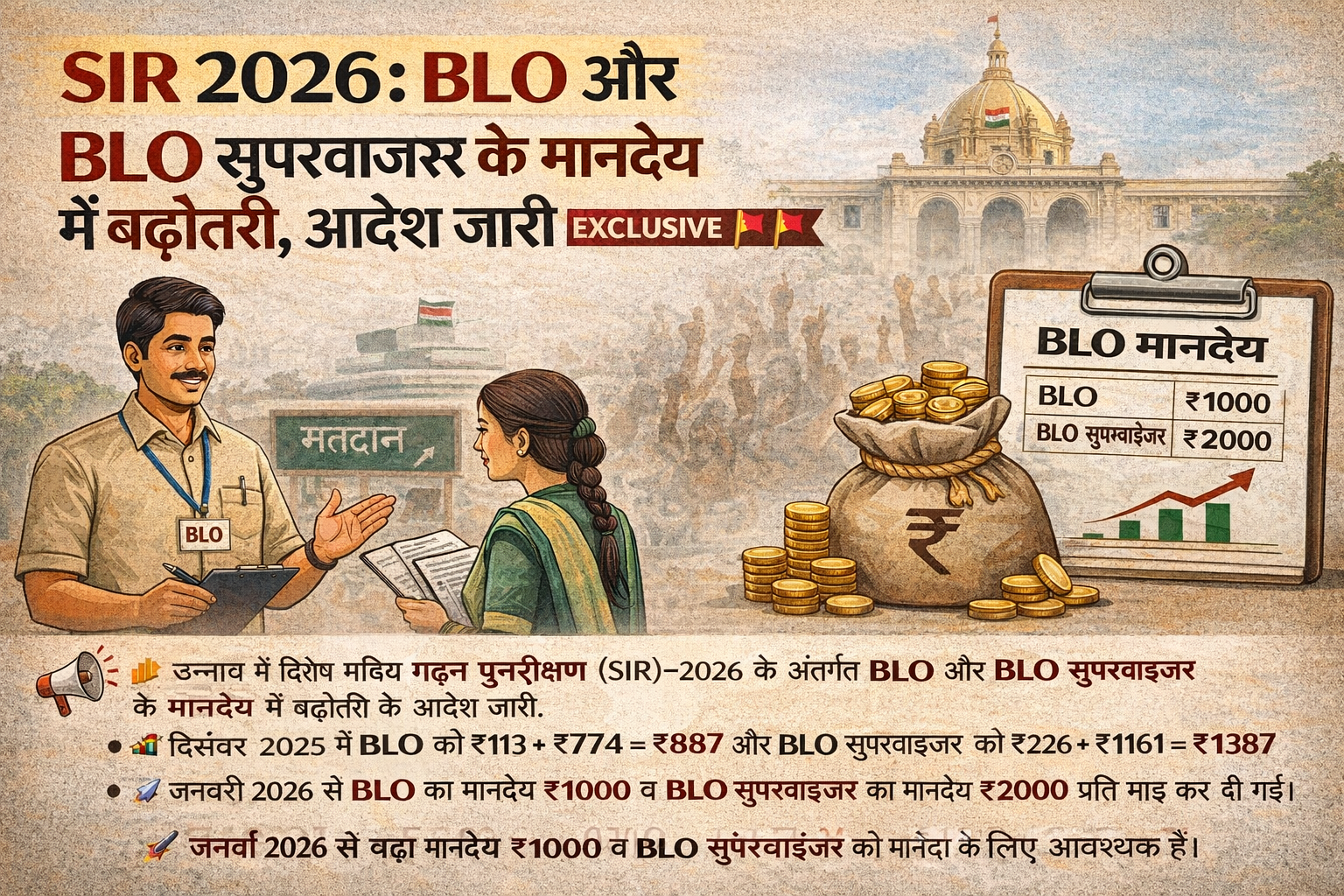 SIR 2026: BLO और BLO सुपरवाइजर के मानदेय में बढ़ोतरी, आदेश जारी उन्नाव। विशेष गहन पुनरीक्षण (SIR)–2026 के तहत नियुक्त बीएलओ (BLO) एवं बीएलओ सुपरवाइजर के मानदेय को लेकर बड़ा अपडेट सामने आया है। इस संबंध में जिला निर्वाचन अधिकारी, उन्नाव की ओर से आधिकारिक पत्र जारी किया गया है, जिसमें दिसंबर 2025 के मानदेय … Read more