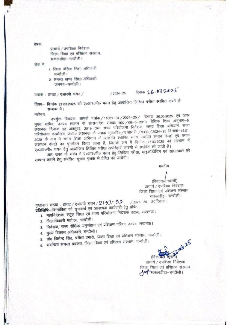 जनपद में ARP चयन परीक्षा हुई स्थगित, बढ़ी डेट March 26, 2025 by Jaswant Singh जनपद में ARP चयन परीक्षा हुई स्थगित, बढ़ी डेट
