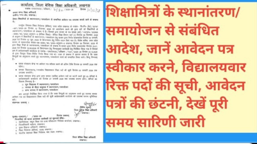 शिक्षामित्रों के स्थानांतरण/समायोजन से संबंधित आदेश, जानें आवेदन पत्र स्वीकार करने, विद्यालयवार रिक्त पदों की सूची, आवेदन पत्रों की छंटनी, देखें पूरी समय सारिणी जारी