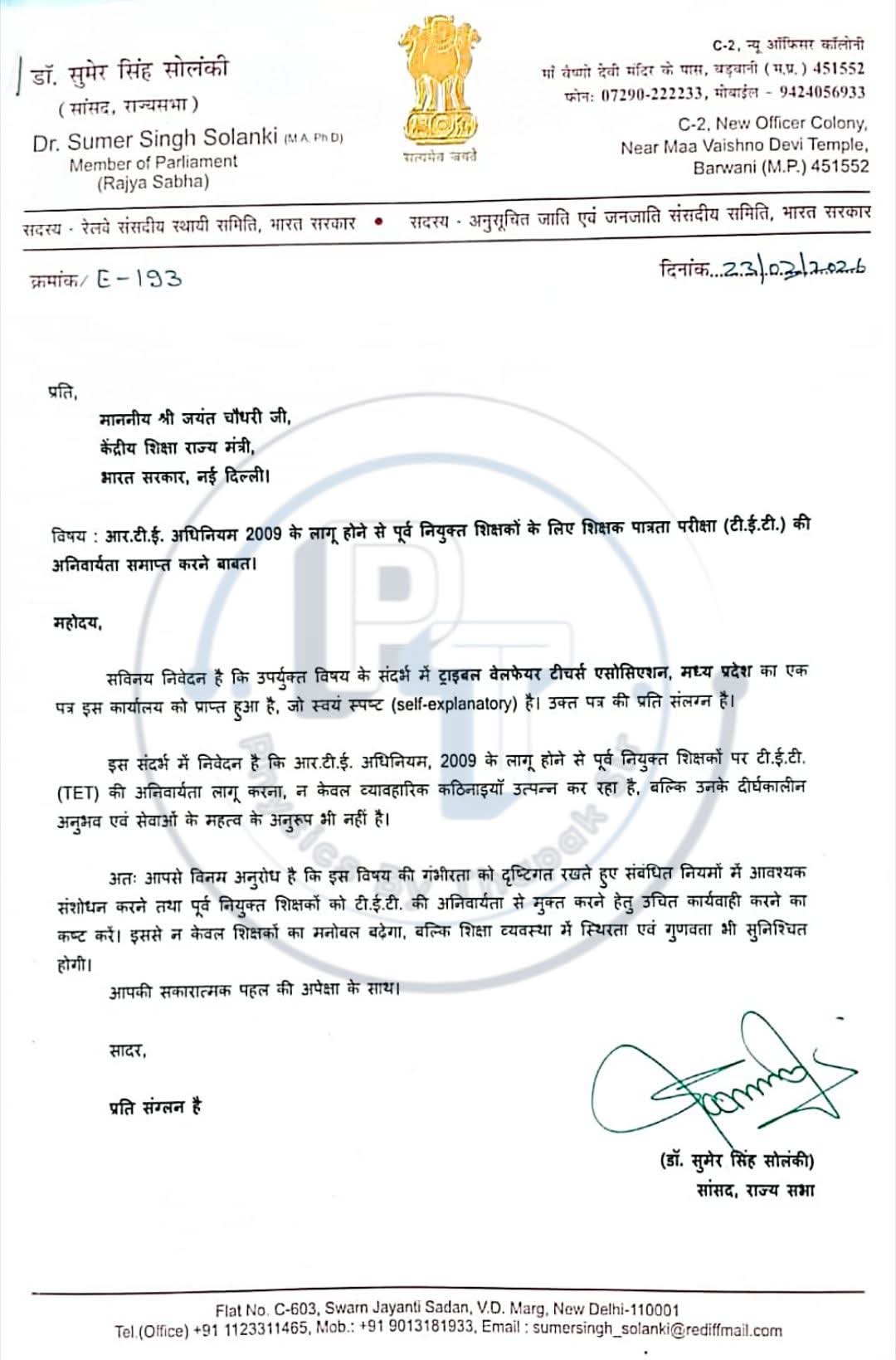 📌 नई दिल्ली | शिक्षा जगत से जुड़ी बड़ी खबर राज्यसभा सांसद डॉ. सुमेर सिंह सोलंकी ने केंद्रीय शिक्षा राज्य मंत्री जयंत चौधरी को एक महत्वपूर्ण पत्र लिखकर टीईटी (TET) अनिवार्यता समाप्त करने की मांग उठाई है।