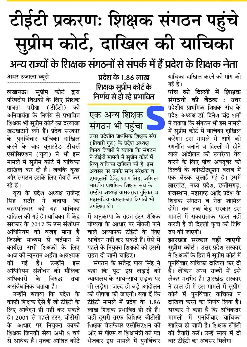 लखनऊ। राज्य सरकार के बाद शिक्षक संगठन शिक्षक संगठन यूनाइटेड टीचर्स एसोसिएशन (यूटा) ने टीईटी को लेकर सुप्रीम कोर्ट में याचिका दाखिल की है।