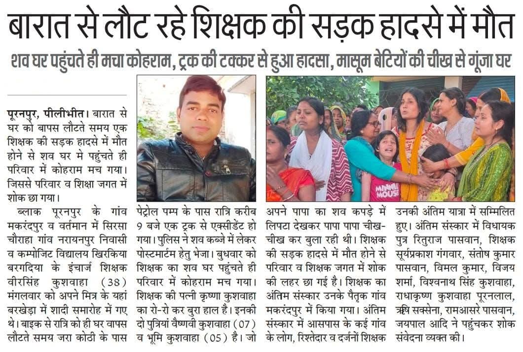 ब्लॉक पूरनपुर के गांव मकरंदपुर व वर्तमान में सिरसा चौराहा गांव नरायनपुर निवासी व कम्पोजिट विद्यालय घिरकिया बरगदिया के इंचार्ज शिक्षक वीरसिंह कुशवाहा (38) मंगलवार को अपने मित्र के यहां बरखेड़ा में शादी समारोह में गए थे। बाइक से रात को ही घर वापस लौटते समय जरा कोठी के पास पेट्रोल पंप के पास रात करीब 9 बजे एक ट्रक से एक्सीडेंट हो गया। पुलिस ने शव कब्जे में लेकर पोस्टमार्टम हेतु भेजा।