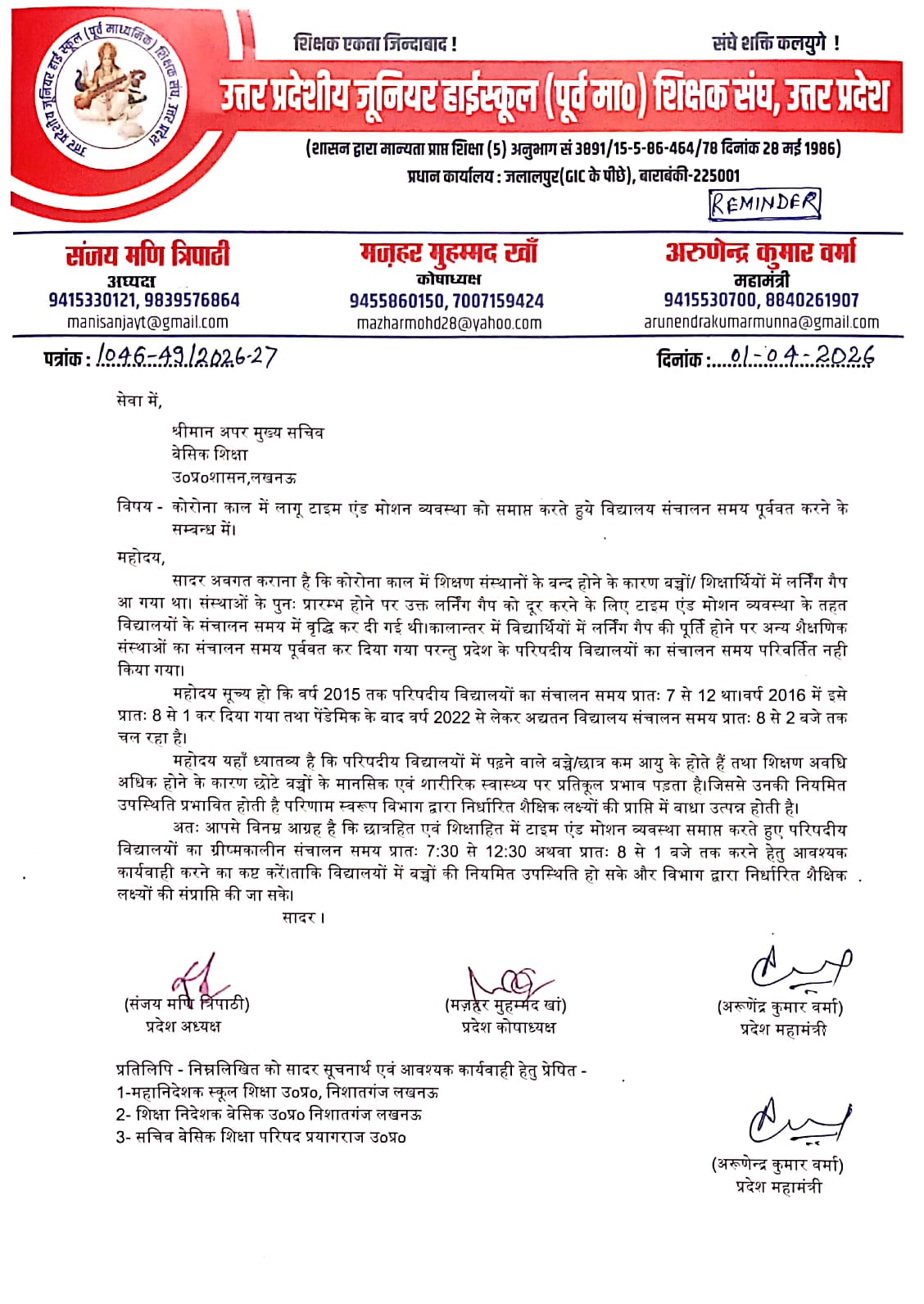 कोरोना काल में लागू टाइम एंड मोशन व्यवस्था को समाप्त करते हुये विद्यालय संचालन समय पूर्ववत करने के सम्बन्ध में।