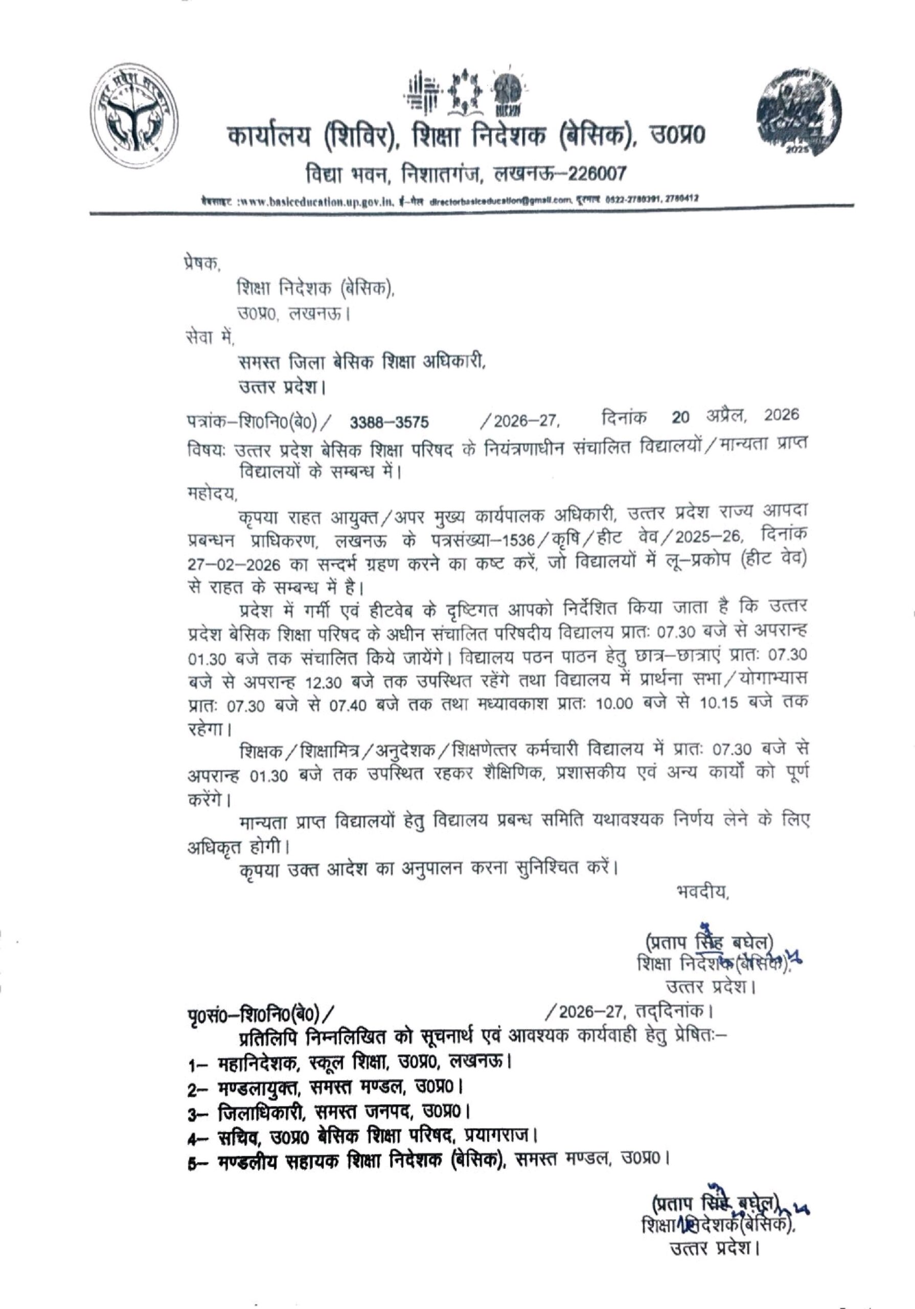 प्रदेश में गर्मी एवं हीटवेब के दृष्टिगत आपको निर्देशित किया जाता है कि उत्तर प्रदेश बेसिक शिक्षा परिषद के अधीन संचालित परिषदीय विद्यालय प्रातः 07.30 बजे से अपरान्ह 01.30 बजे तक संचालित किये जायेंगे। विद्यालय पठन पाठन हेतु छात्र-छात्राएं प्रातः 07.30 बजे से अपरान्ह 12.30 बजे तक उपस्थित रहेंगे तथा विद्यालय में प्रार्थना सभा/योगाभ्यास प्रातः 07.30 बजे से 07.40 बजे तक तथा मध्यावकाश प्रातः 10.00 बजे से 10.15 बजे तक रहेगा।