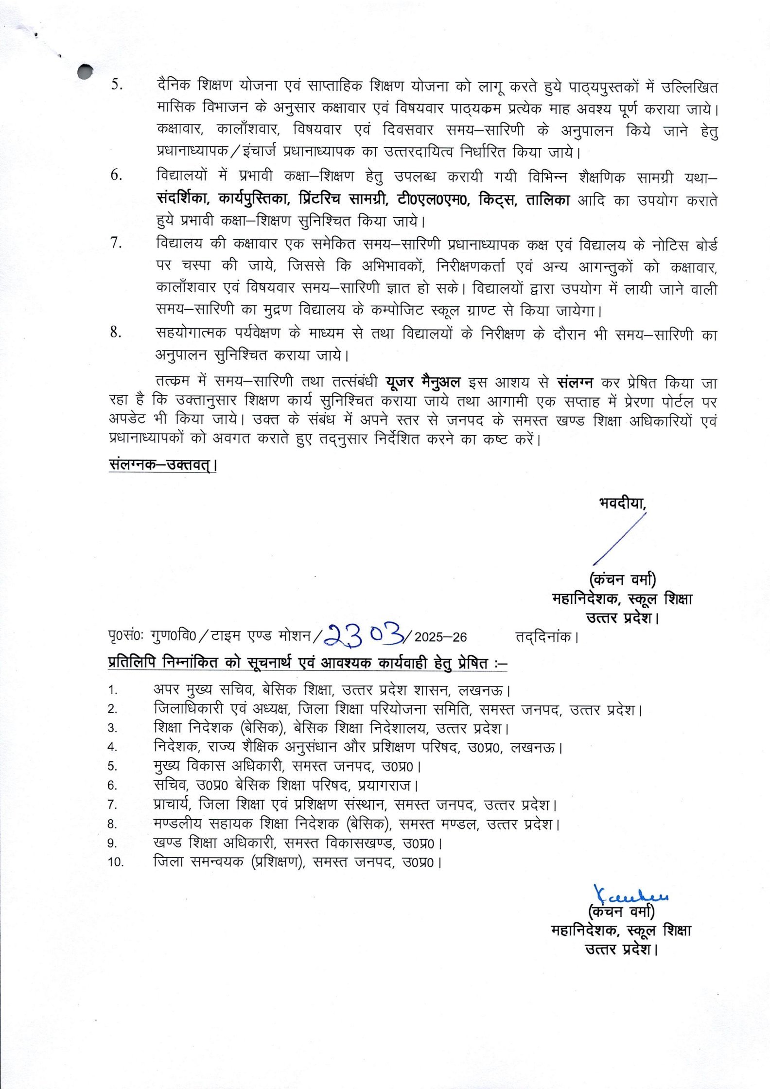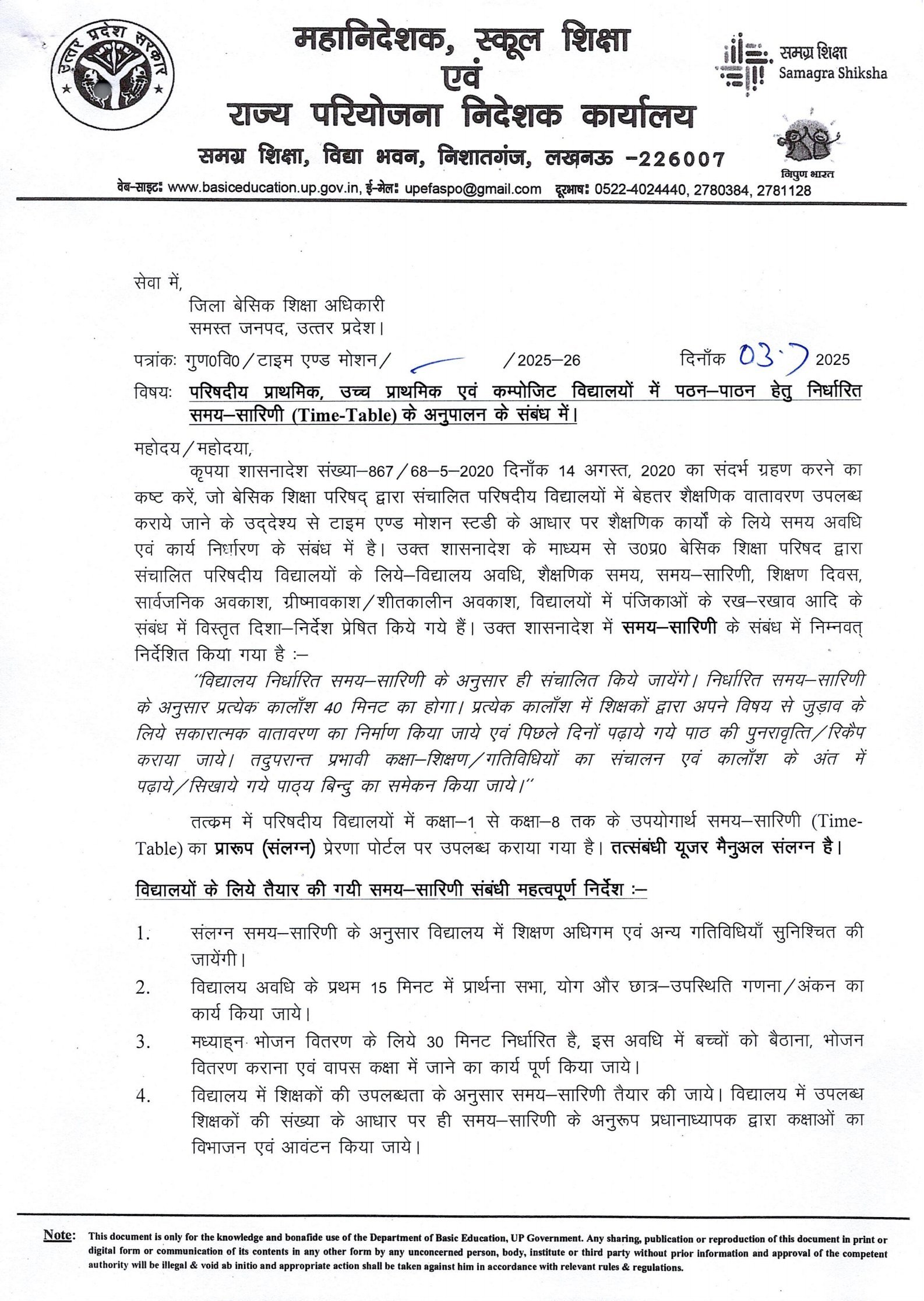 Time-Table:- परिषदीय प्राथमिक, उच्च प्राथमिक एवं कम्पोजिट विद्यालयों में पठन-पाठन हेतु निर्धारित समय-सारिणी (Time-Table) के अनुपालन के संबंध में।