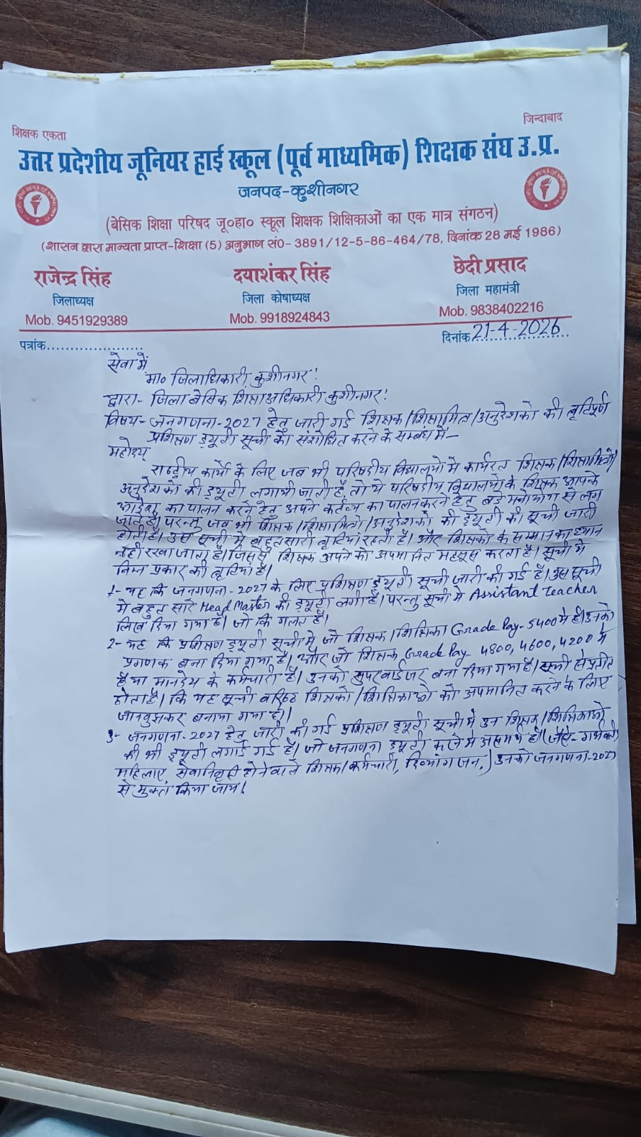 उत्तर प्रदेशीय जूनियर हाई स्कूल (पूर्व माध्यमिक) शिक्षक संघ, जनपद कुशीनगर ने जनगणना 2027 के प्रशिक्षण कार्य को लेकर जिला प्रशासन को पत्र भेजकर अपनी आपत्तियां दर्ज कराई हैं। संघ का कहना है कि परिषदीय विद्यालयों में कार्यरत शिक्षक-शिक्षिकाओं को प्रशिक्षण ड्यूटी में शामिल करने के दौरान कई विसंगतियां सामने आ रही हैं।