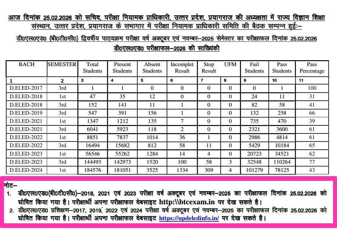 UP D.El.Ed Result 2026:- डीएलएड. प्रथम और तृतीय सेमेस्टर का रिजल्ट हुआ घोषित, नीचे दिए गए लिंक का प्रयोग करें