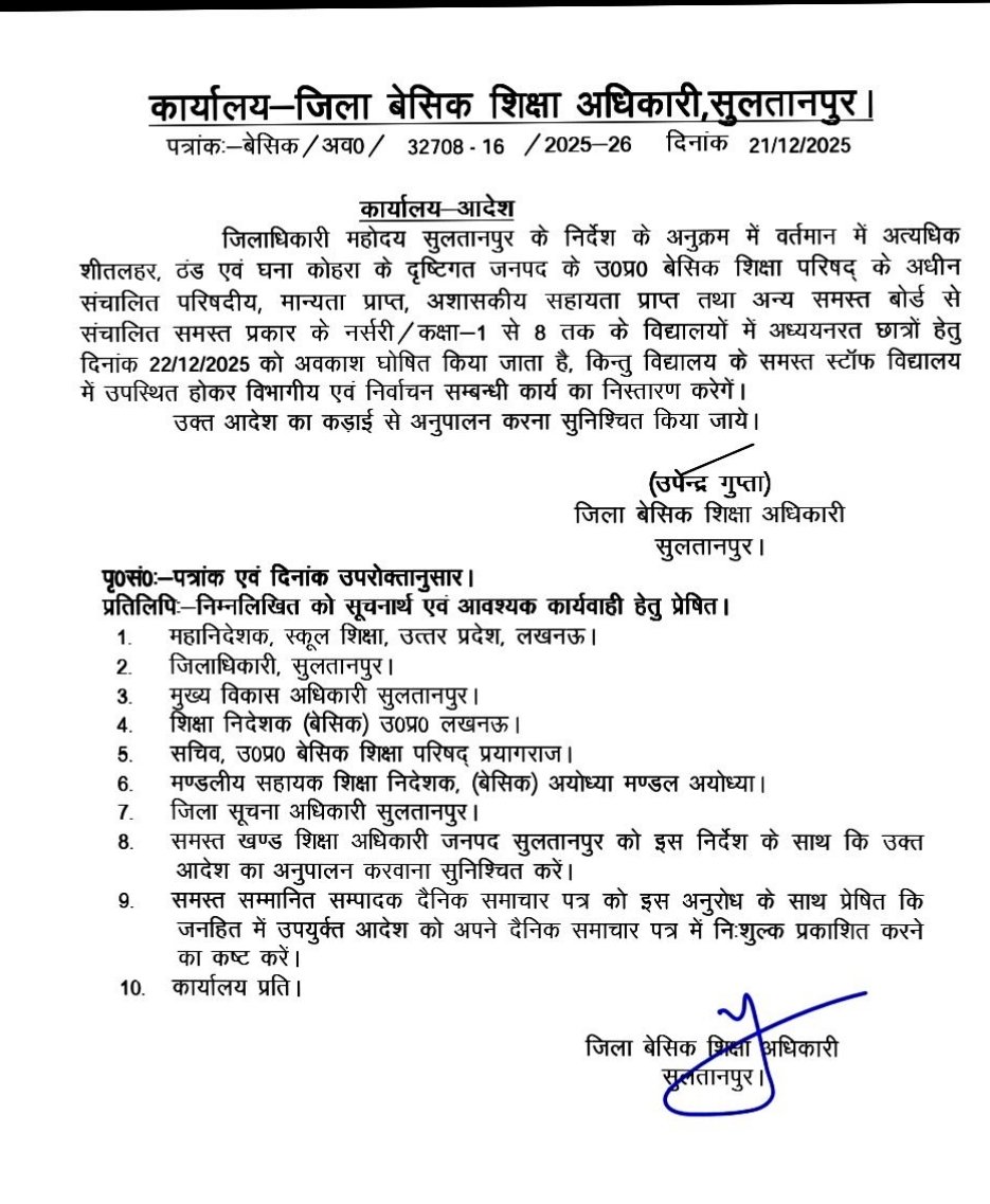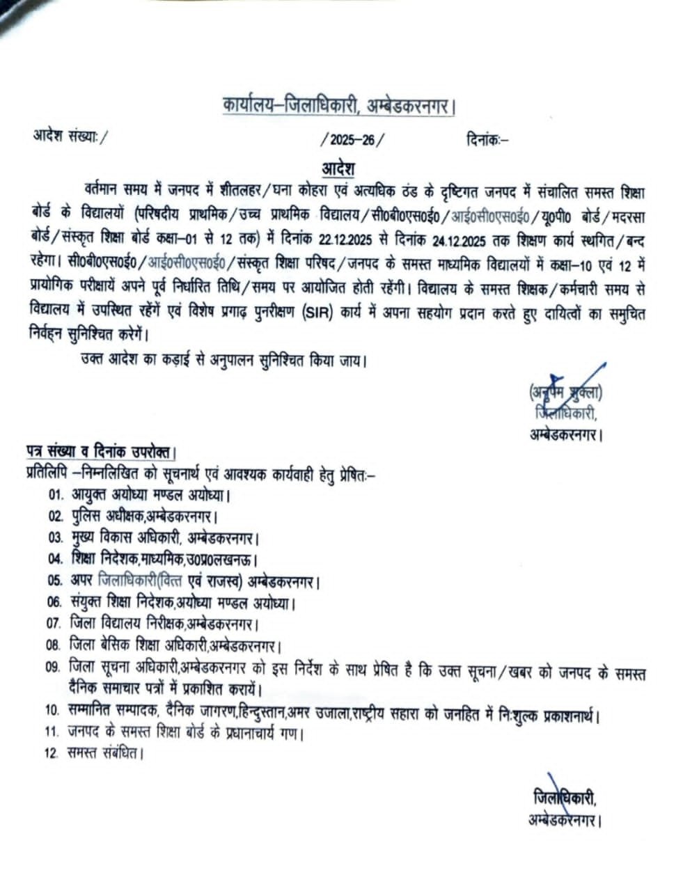अंबेडकर नगर जिले में पड़ रही अत्यधिक ठंड के दृष्टिगत जिलाधिकारी अनुपम शुक्ला ने जनपद में संचालित सभी बोर्ड के कक्षा एक 12 के विद्यालयों को 24 दिसम्बर तक बंद रखने का आदेश दिया है। उन्होंने कहा है कि जनपद के समस्त माध्यमिक विद्यालयों में कक्षा 10 एवं 12 में प्रायोगिक परीक्षायें अपने पूर्व निर्धारित समय पर आयोजित होती रहेंगी। वहीं विद्यालय के समस्त शिक्षक कर्मचारी समय से विद्यालय में उपस्थित रहेंगें एवं विशेष प्रगाढ़ पुनरीक्षण (एसआईआर) कार्य में अपना सहयोग प्रदान करेंगे। जिला विद्यालय निरीक्षक प्रवीण कुमार तिवारी ने सभी विद्यालयों से आदेश का कड़ाई से अनुपालन करने के लिए कहा है। वहीं दूसरी ओर मेरठ में डीएम ने आठवीं तक के स्कूलों को बंद रखने का आदेश दिया है। डीएम के आदेश के अनुसार इंटर तक के स्कूलों को 23 तक बंद रखा जाएगा। इसके अलावा कई जिलों में स्कूलों के समय को बदल दिया गया।