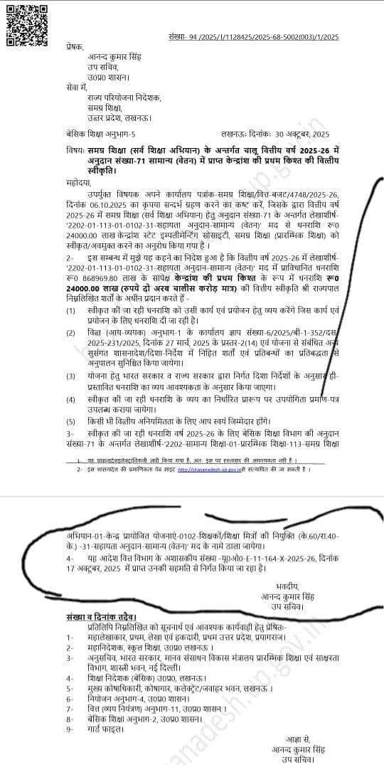 उपर्युक्त विषयक अपने कार्यालय पत्रांक-समग्र शिक्षा/वित्त-बजट/4748/2025-26, दिनांक 06.10.2025 का कृपया सन्दर्भ ग्रहण करने का कष्ट करें, जिसके द्वारा वित्तीय वर्ष 2025-26 में समग्र शिक्षा (सर्व शिक्षा अभियान) हेतु अनुदान संख्या-71 के अन्तर्गत लेखाशीर्ष-2202-01-113-01-0102-31-सहायता अनुदान सामान्य (वेतन)’ मद से धनराशि रू० 24000.00 लाख केन्द्रांश स्टेट इम्पलीमेन्टिंग सोसाइटी, समग्र शिक्षा (प्रारम्भिक शिक्षा) को स्वीकृत/अवमुक्त करने का अनुरोध किया गया है।