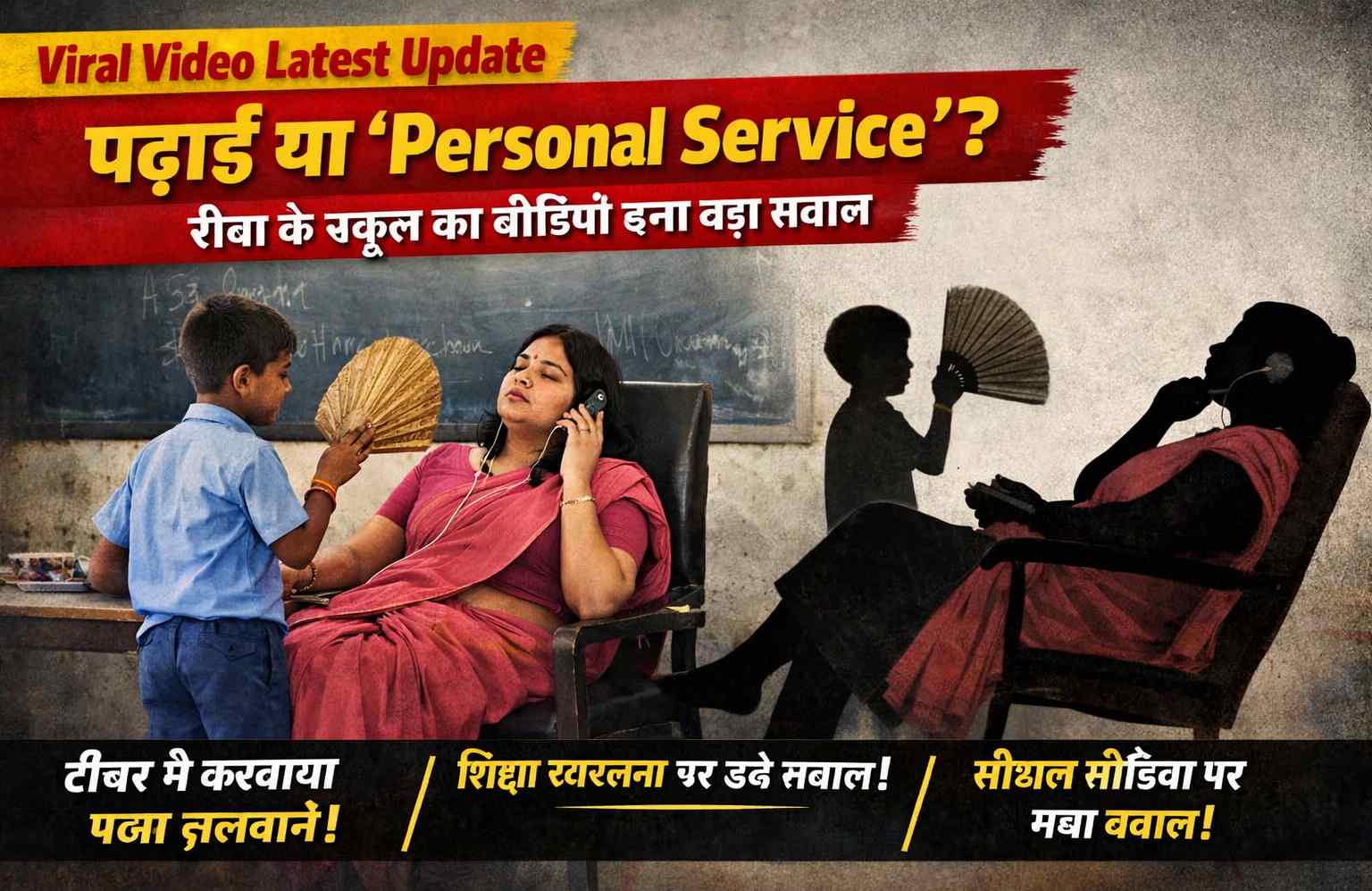 उधर, एक छोटा बच्चा उनके पीछे खड़ा है। वह लगातार पंखा झल रहा है। कुछ देर बाद बच्चे की थकान साफ दिखती है। वह बीच-बीच में हाथ पकड़ता है, जैसे दर्द हो रहा हो। लेकिन टीचर की तरफ से कोई प्रतिक्रिया नजर नहीं आती।