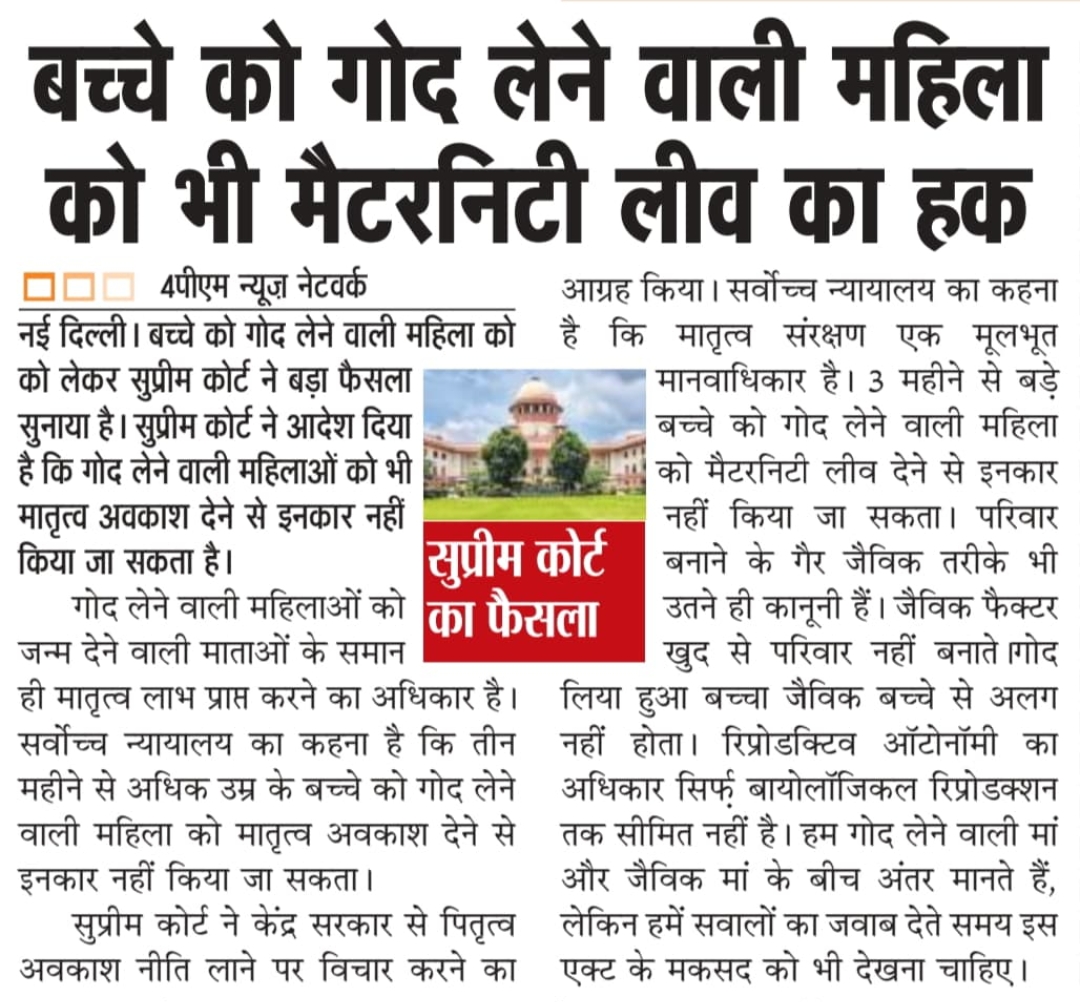 ✅ सुप्रीम कोर्ट ने दत्तक मां को 12 हफ्ते के मातृत्व अवकाश (मैटरनिटी लीव) सभी मामलों के लिए बढ़ा दिया है
