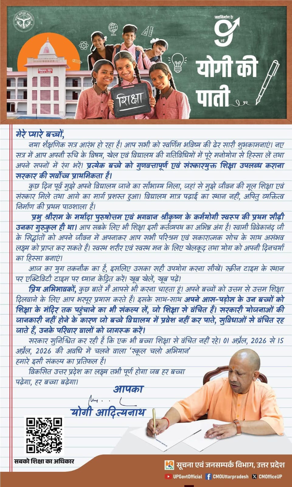 📰 ‘योगी की पाती’ से छात्रों को संदेश: नए सत्र में शिक्षा, संस्कार और खेल पर जोर